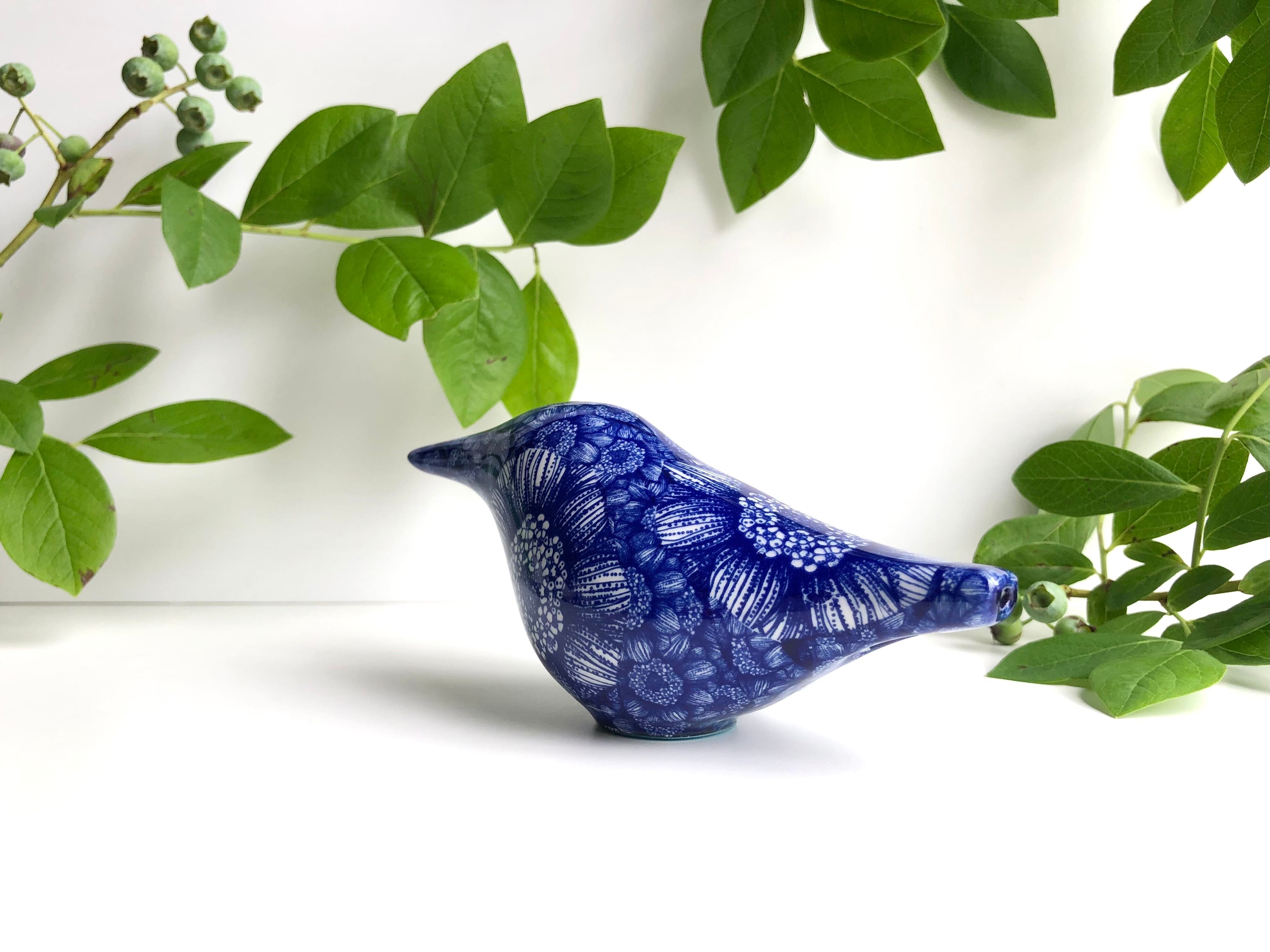 小鳥の本体には、ヘイニさんがデザインした図案がハンドデコレーションで施されています。(こちらの作品には白地にネイビーで様々な花模様がデザインされています。)