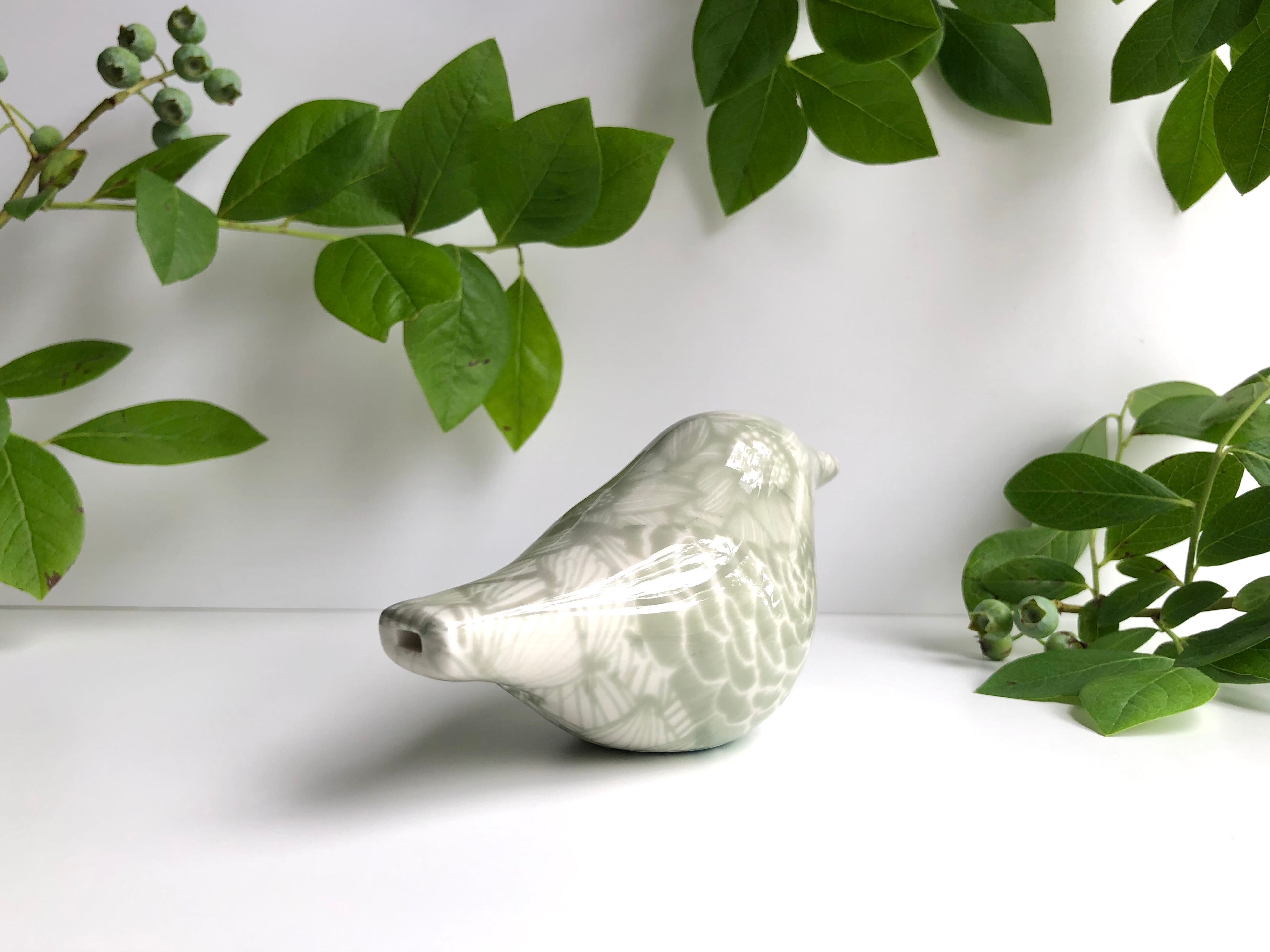 小鳥の本体には、ヘイニさんがデザインした図案がハンドデコレーションで施されています。(こちらの作品には白地に淡い薄緑で様々な花模様がデザインされています。)