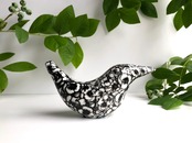 小鳥の本体には、ヘイニさんがデザインした花柄の図案がハンドデコレーションで施されています。(こちらの作品には白地に黒一色でビオラの花がデザインされています。)
