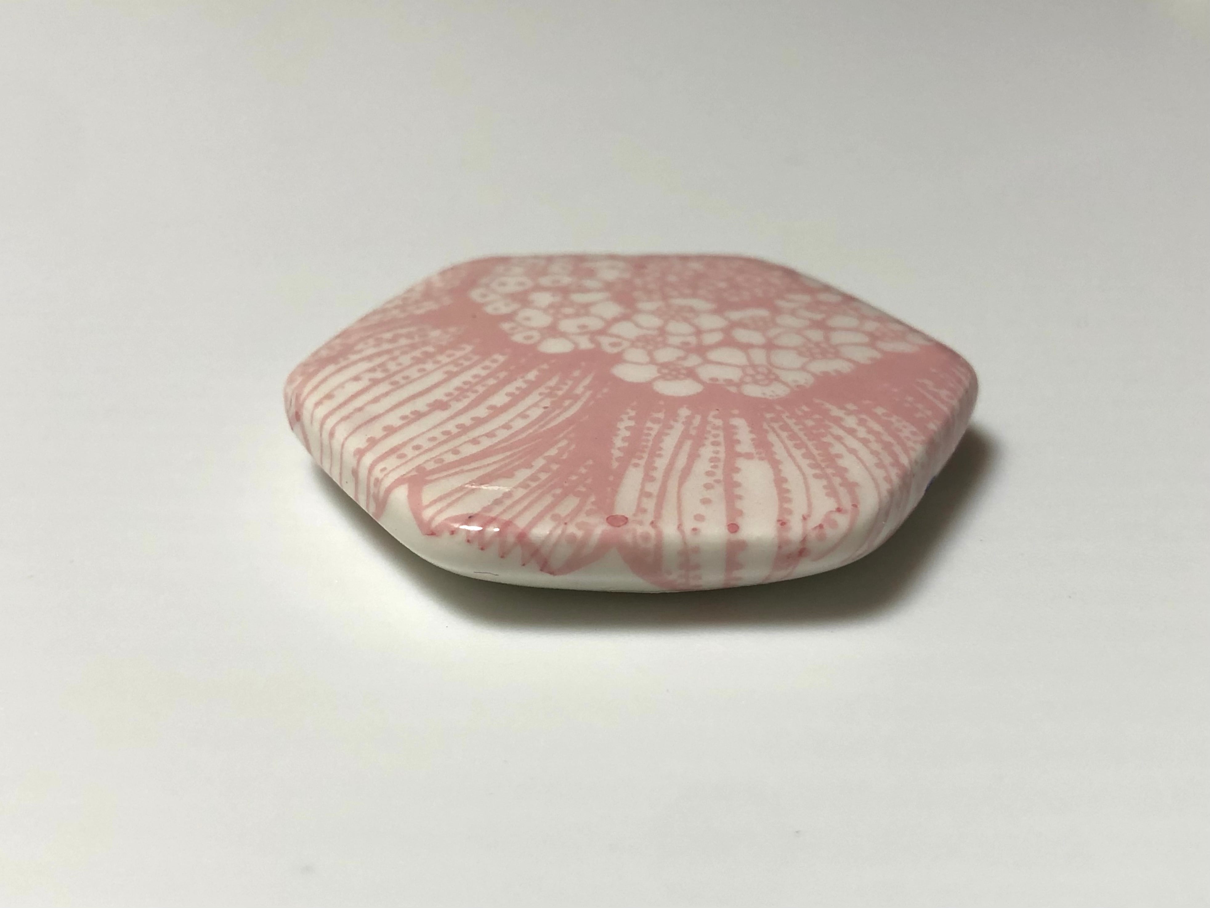 このミニヘキサゴンは、白地にピンクで大きな花柄の一部が施されています。