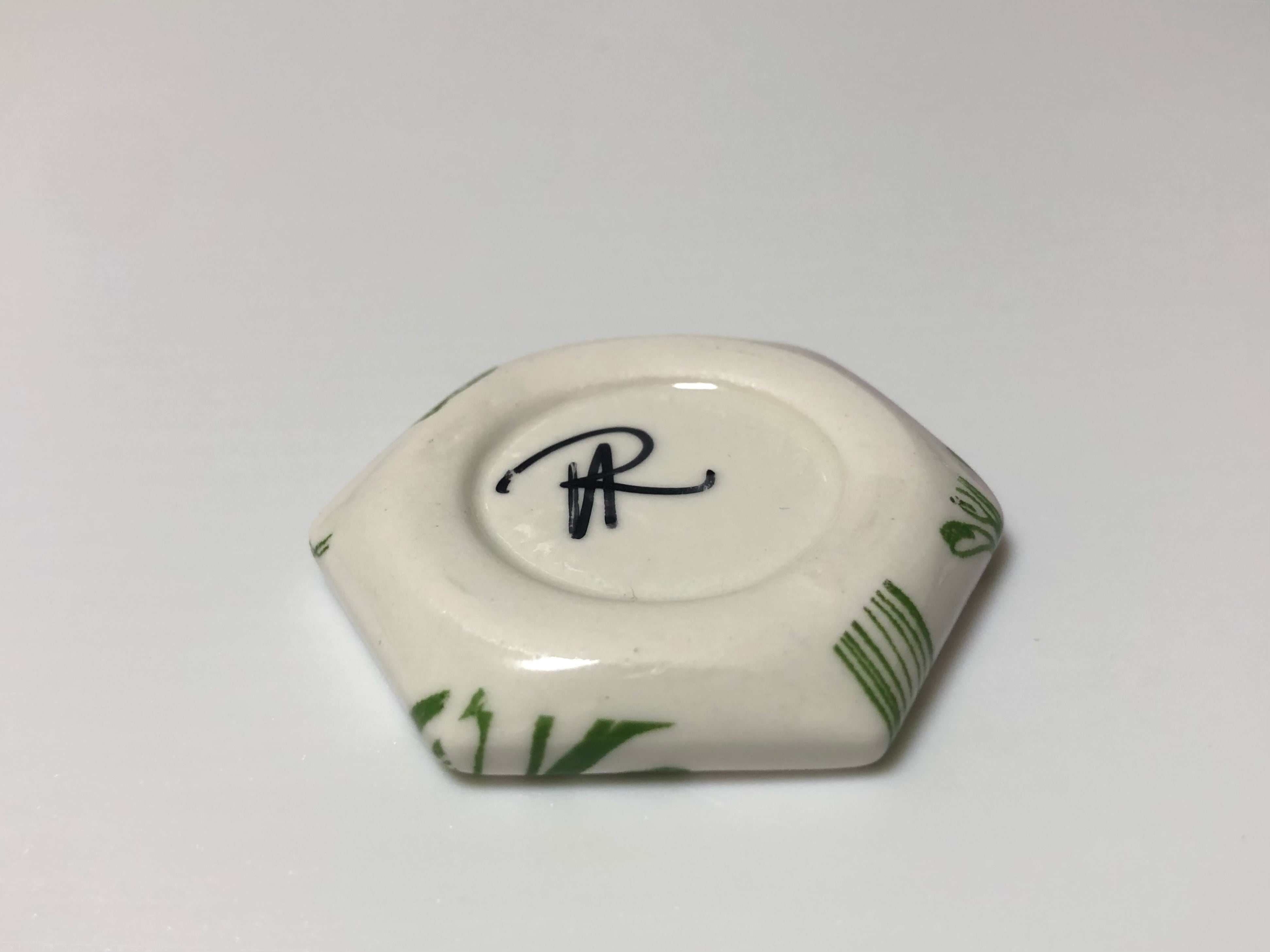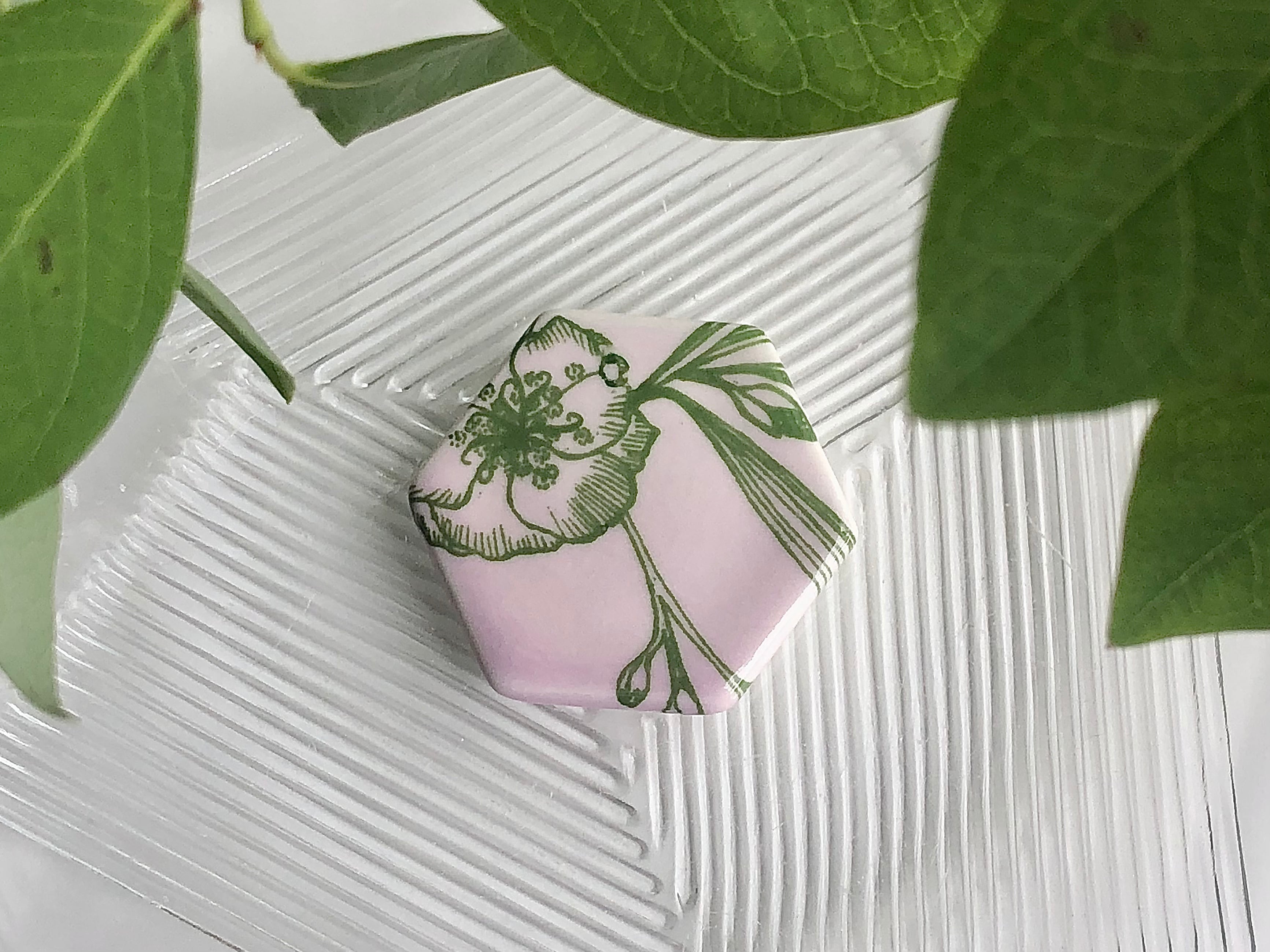 このミニヘキサゴンは、ベースに薄いピンクパープルの釉薬が掛けられており、その上からグリーンの花柄が施されています。