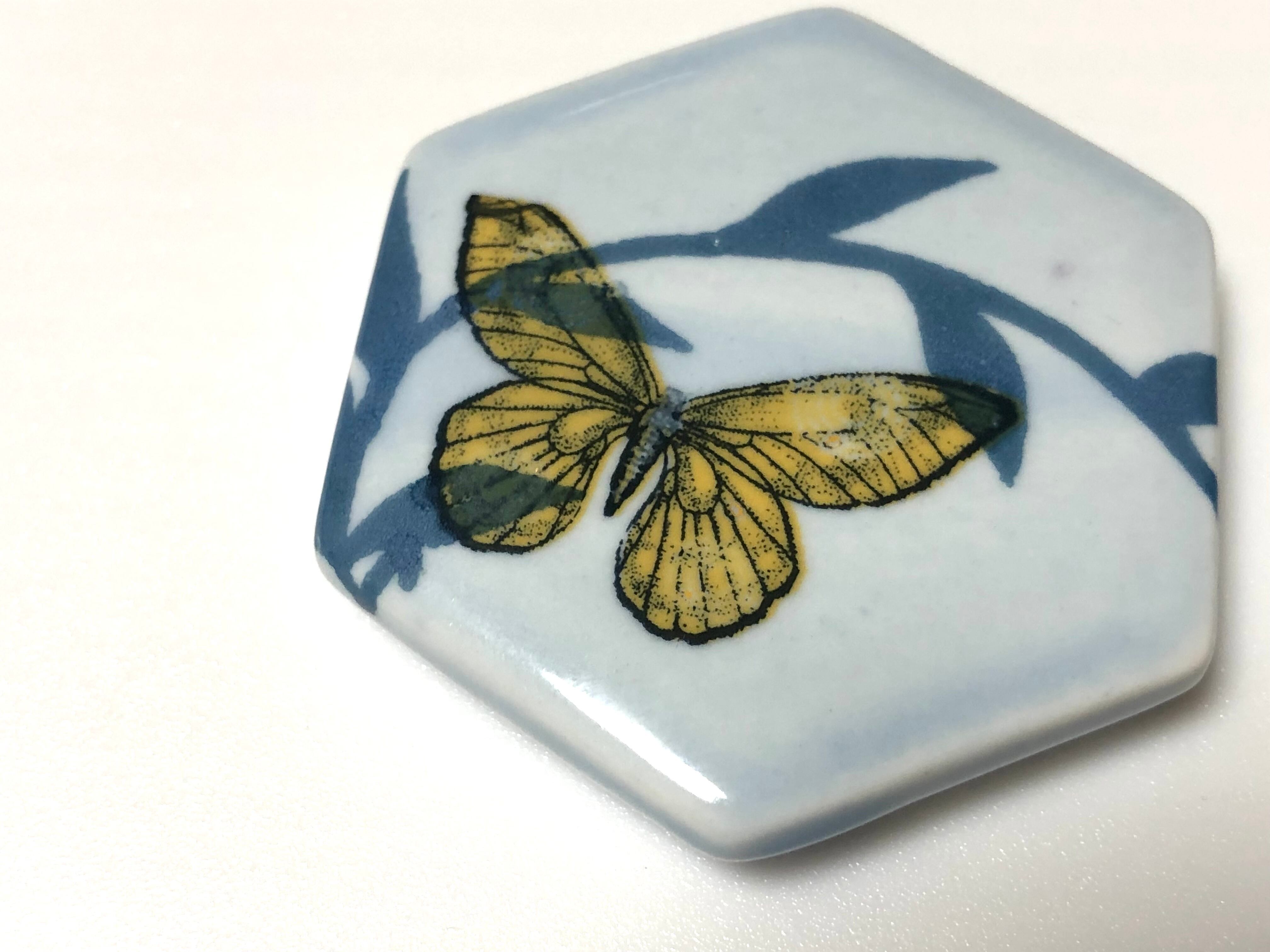 このミニヘキサゴンは、ベースに薄いスモーキーなブルーの釉薬が掛けられており、その上から黄色のちょうちょと、スモークブルーの枝葉がシルエットのように施された凝った仕上がりです。