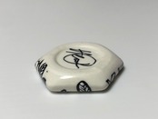 このミニヘキサゴンは、ベースに淡いピンクの釉薬がほんのりと掛けられており、その上から黒いアウトレインで描かれたブルーベリーの柄が施されています。