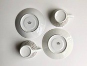 白地にゴールドのドットとブラックの華奢なラインで模様が描かれており、プレートやソーサーには中心から輪が広がっていくような形に配列されています。
