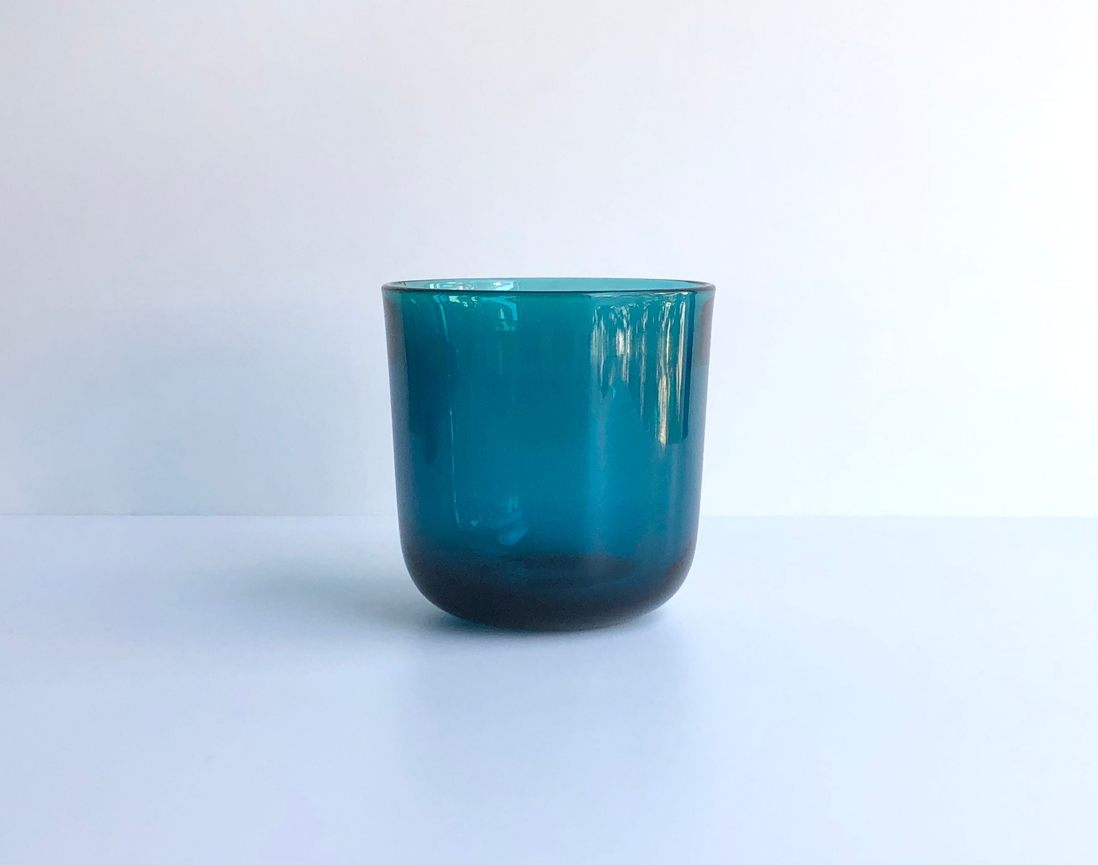 1964年から1972年にかけて、ヌータヤルヴィで製造されたガラスウエアのシリーズで、ぽってりと厚みのあるガラスを用いて、底に丸みを持たせた安定感のあるデザインです。口から1.8cm程は斜めにそがれたデザインになっていて、視覚的な特徴と口当たりの良さを兼ねたカイフランクらしいデザイン性を楽しめます。