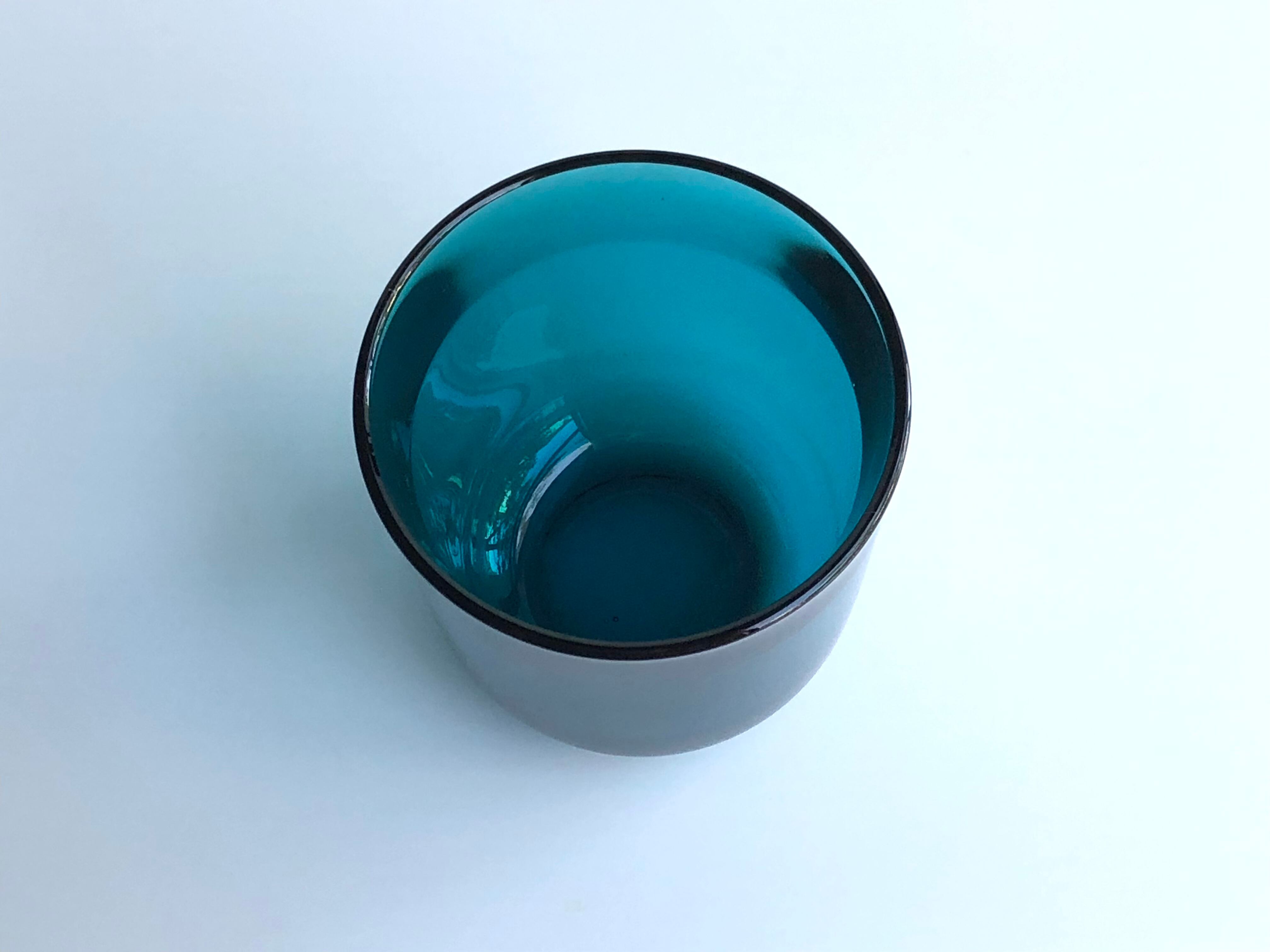 グラスの口周りは色がやや黄味がかったもやのようなものが見えますが、この状態はイッタラやヌータヤルヴィの古いガラスに多く見られる状態です。製造や加工の段階で出来てしまうもののようです。光に透かさなければ気にならない程度です。