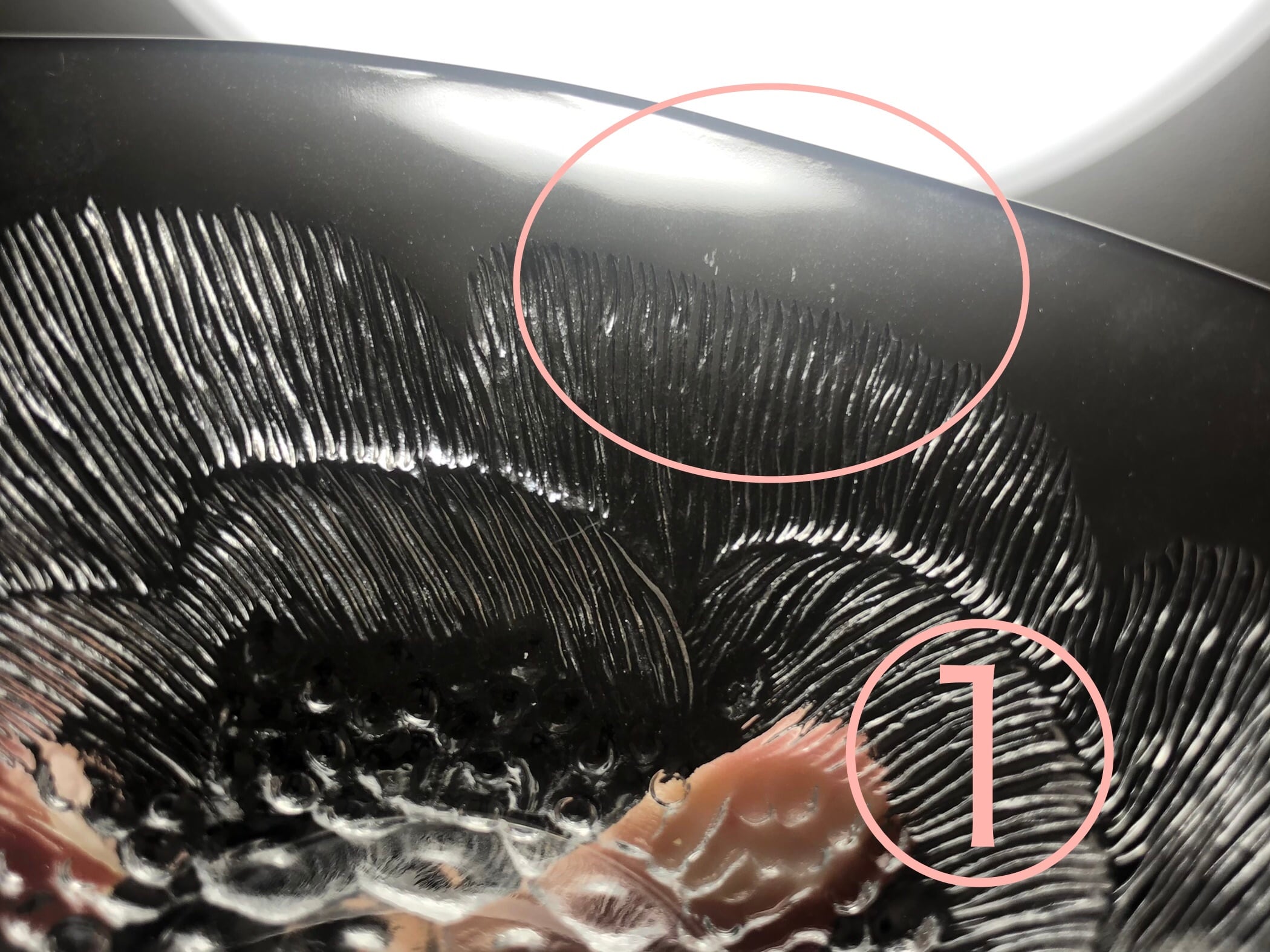 また製造時に出来るガラスのむらやシワ、小さなプレス傷(型によって残る線状や点状のあと)が見られます。ガラスの中に閉じ込められた微細な気泡、小さな混入物がみられることもございます。