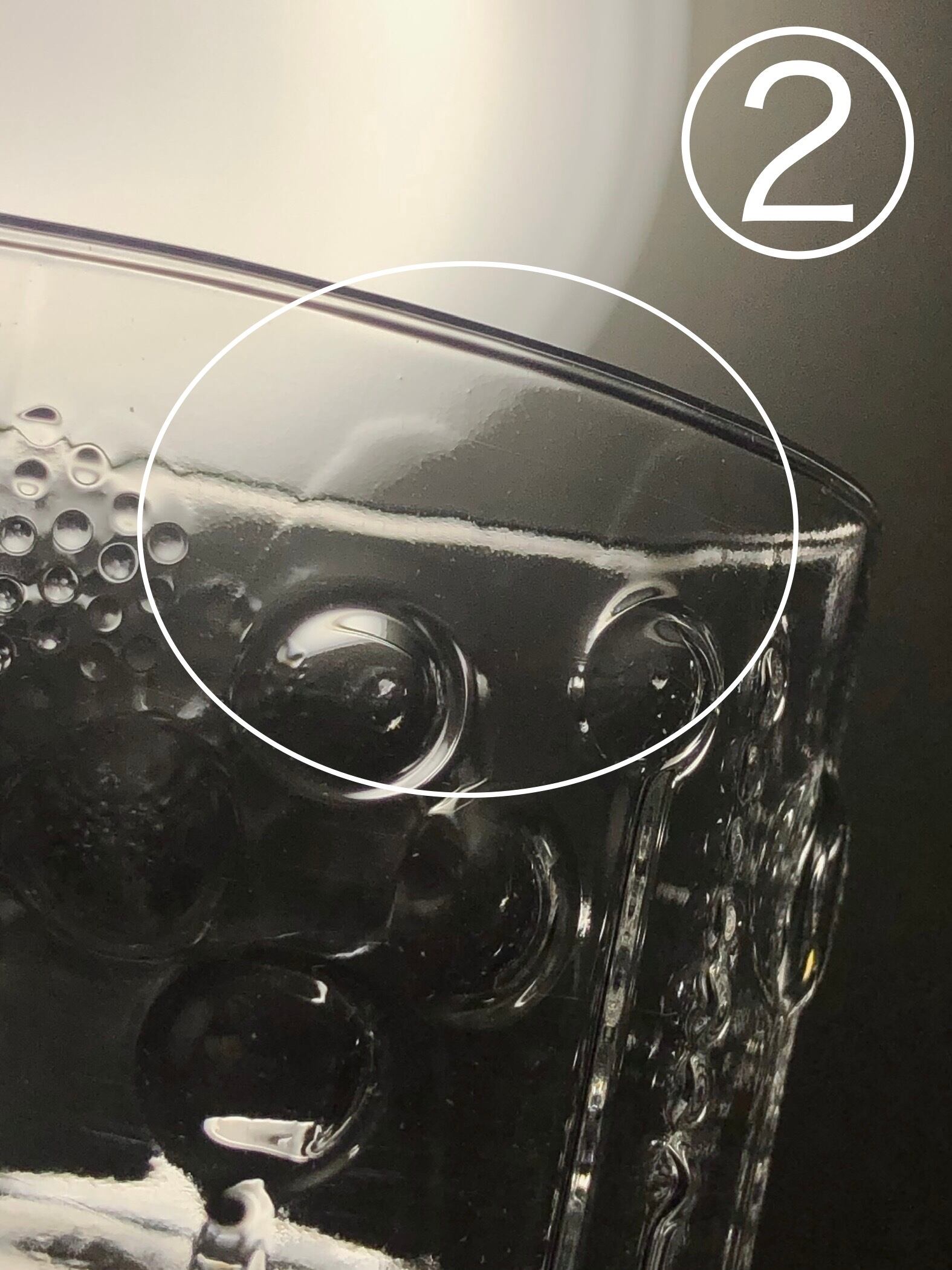 製造上の物ですが、僅かな気泡の混入や、ガラス表面に現れるざらつき、ムラの見られるものがございます。また、ボウルの口元になだらかに盛り上がった個所がございます。