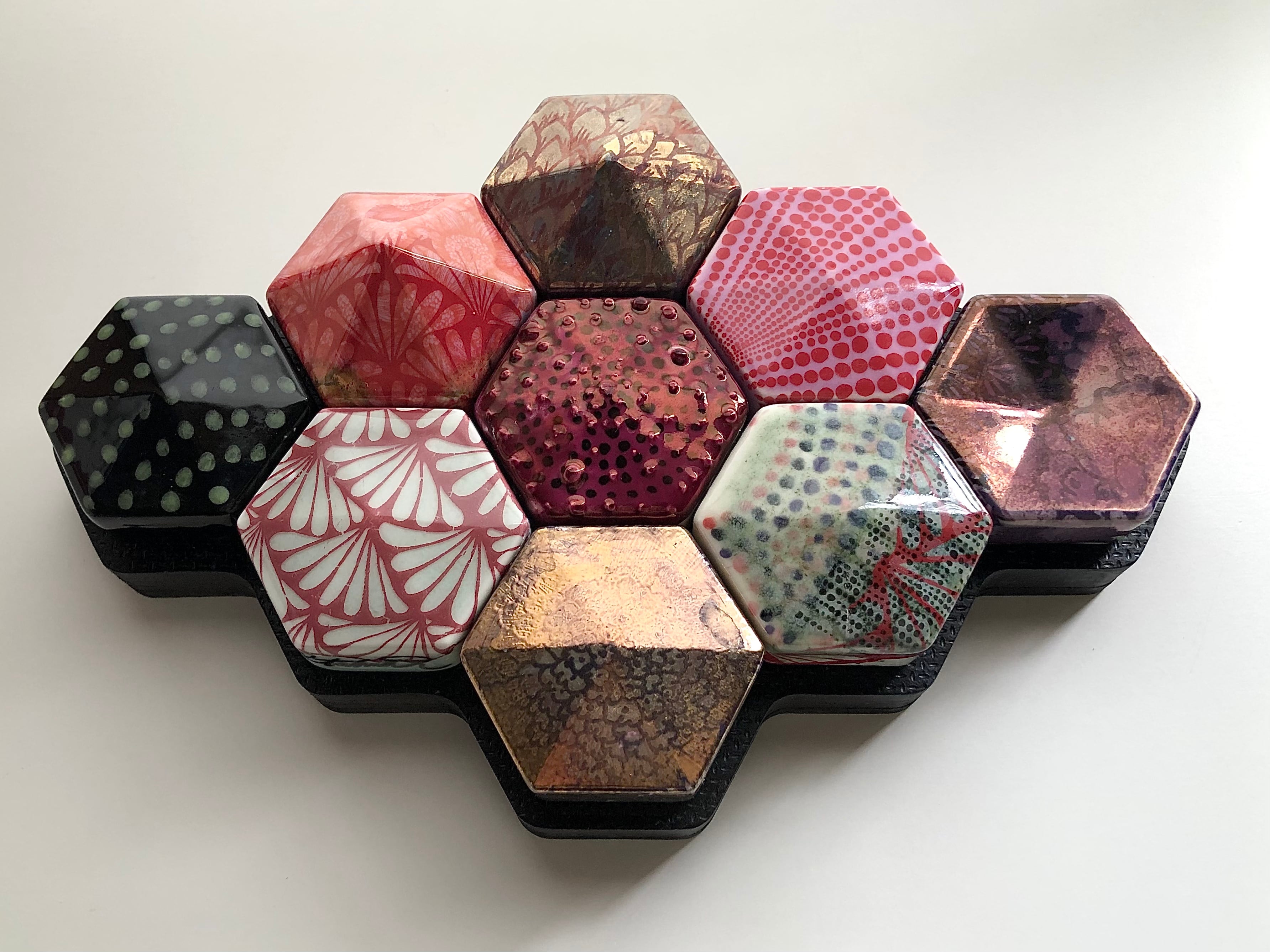 一つ一つのヘキサゴンには、シルクスクリーンや手彩色を組み合わせて異なる装飾が施され、それらが9つが組み合わされて一つの景色になっている姿がとても印象的で、クローズアップしてみれば見るほど新しい発見があるような素晴らしい作品です。