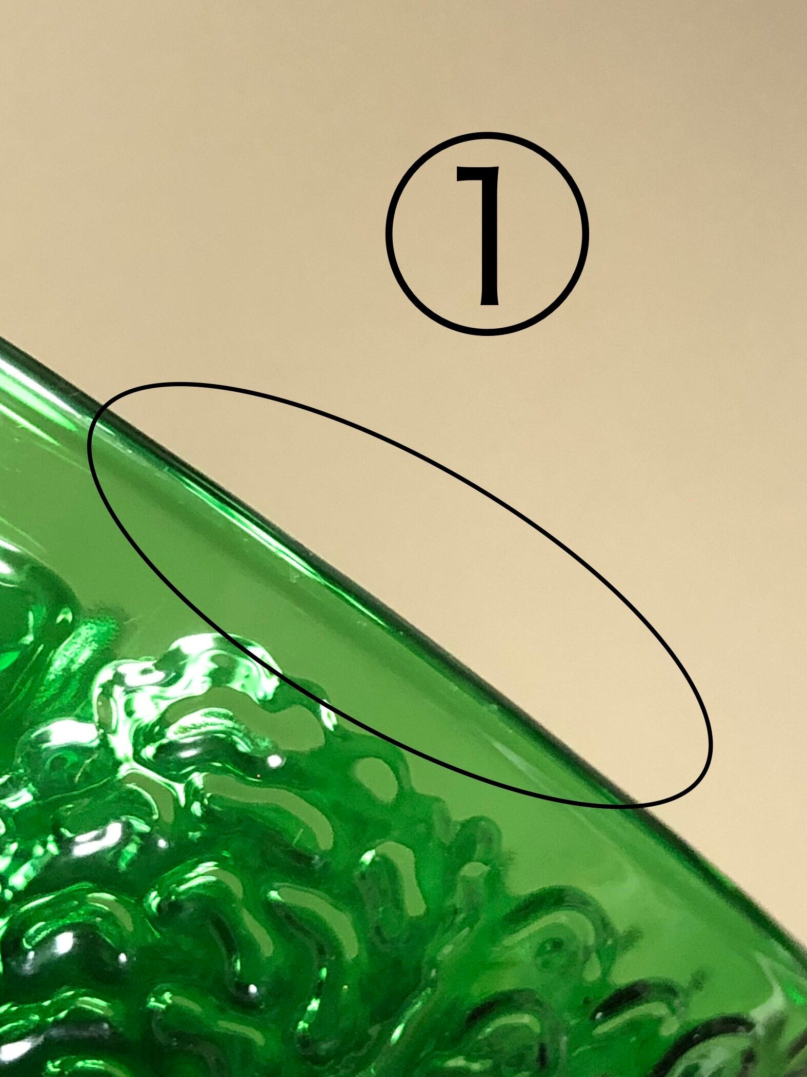 ガラスをカットした後に切り口(ボウルの縁)にガラスを巻き付ける製法のため、縁に小さな盛り上がりや揺らぎが出ることがございます。