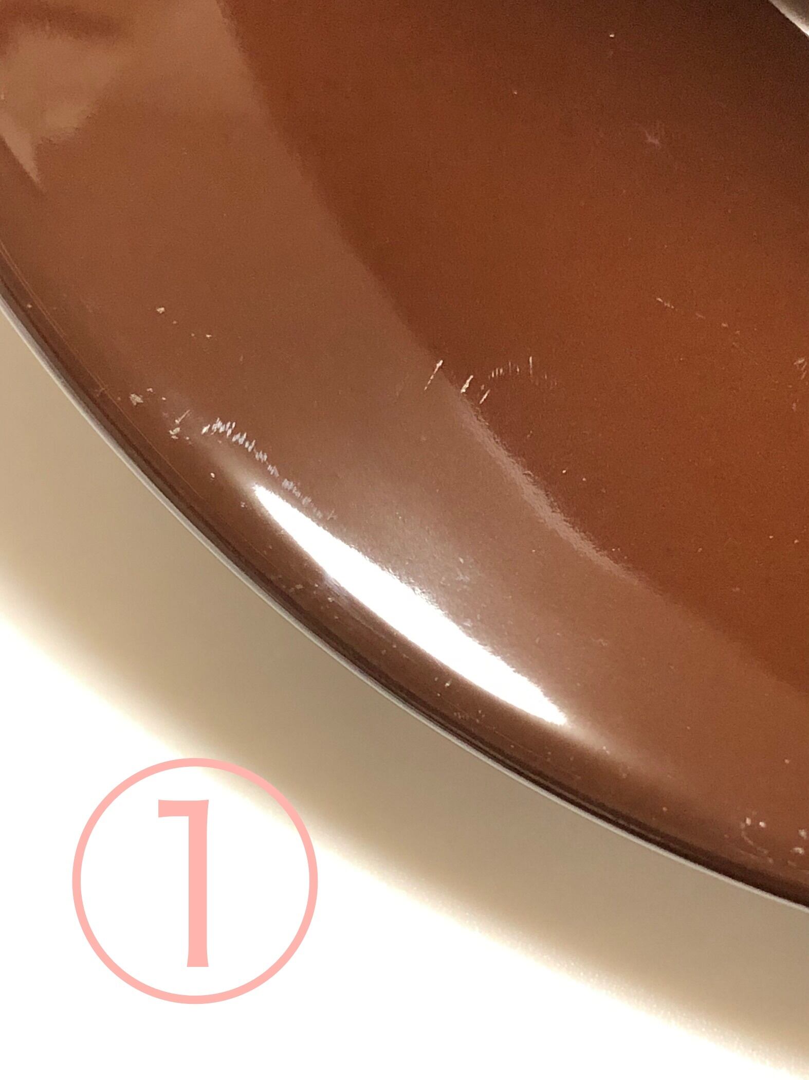 色が濃いので光にかざすと見える擦れが僅かに見られますが、深いスレはなくその程度は軽微です。縁には他のプレートに擦れたような薄い小傷がみられます。