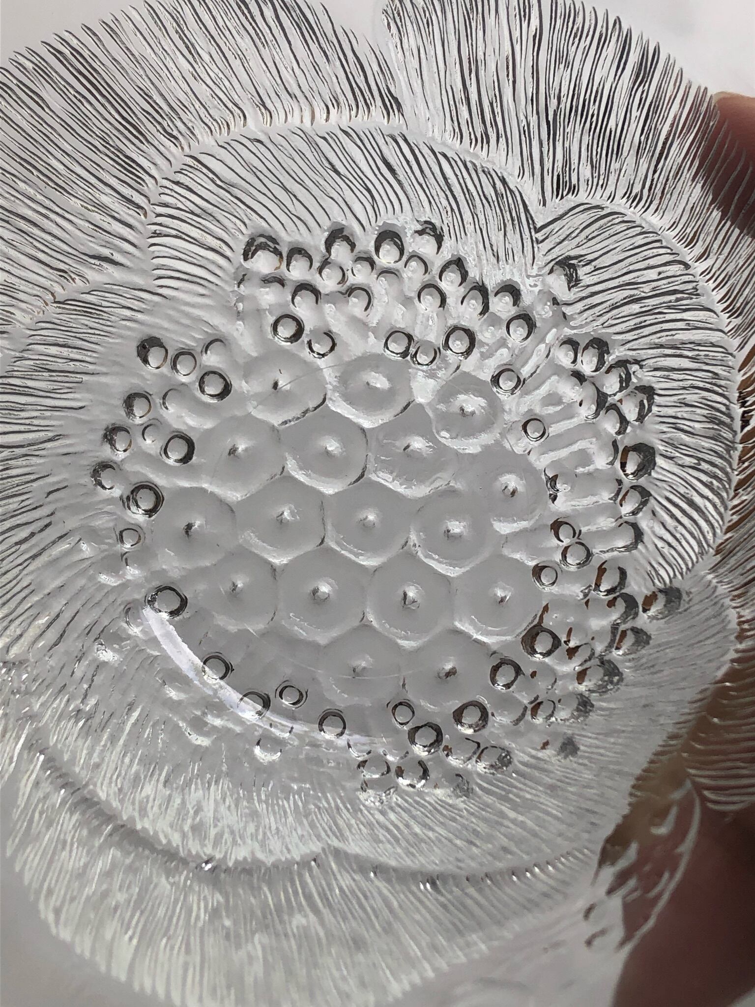 蕾から大輪の花を咲かせるまでの様子を繊細かつ大胆にプレスした、ガラス製のテーブルウェアシリーズ ピオニは時代を超えた今でも古びることなくコレクターに愛され続けています。