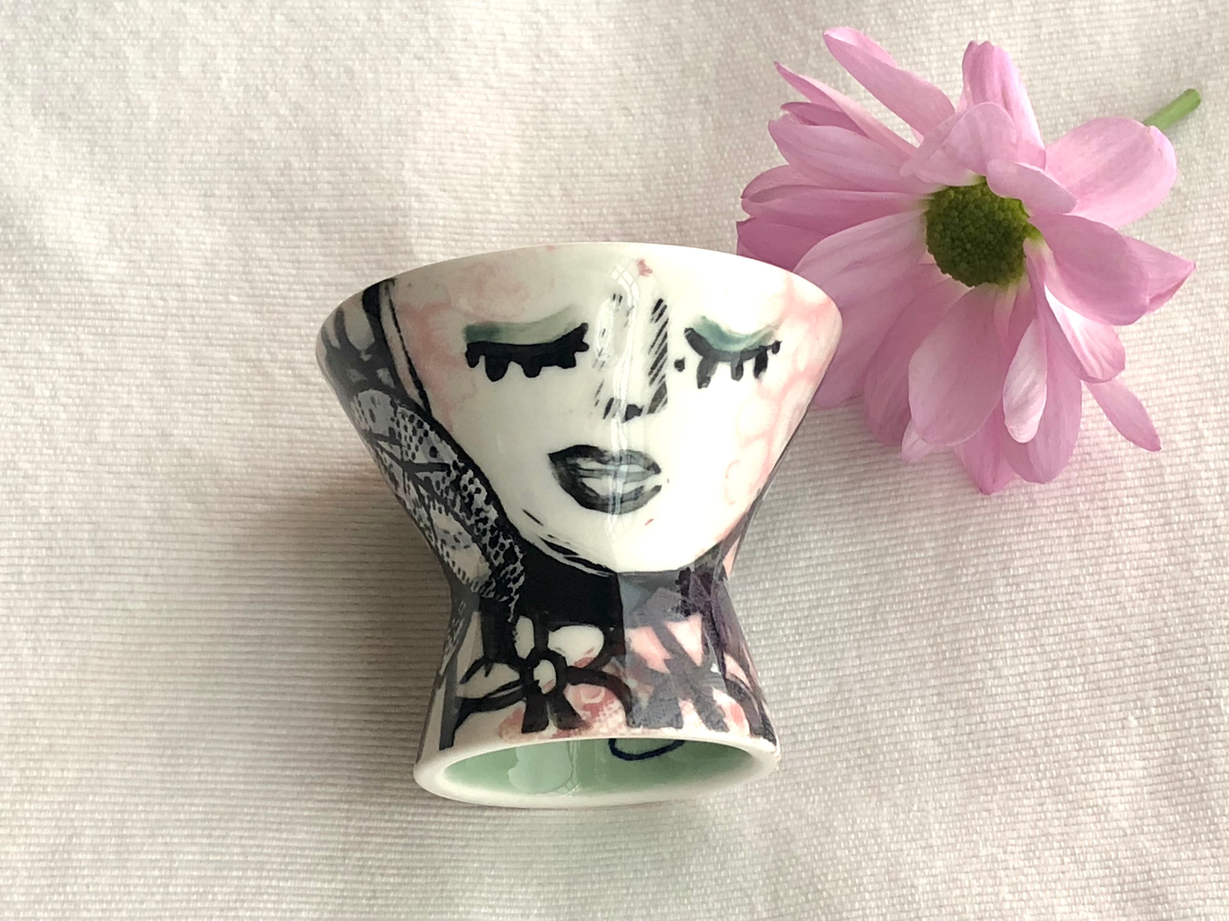 盃状のカップには一つ一つ、すべてヘイニリータフフタ本人の手色彩によって女の子の顔が絵付けされています。