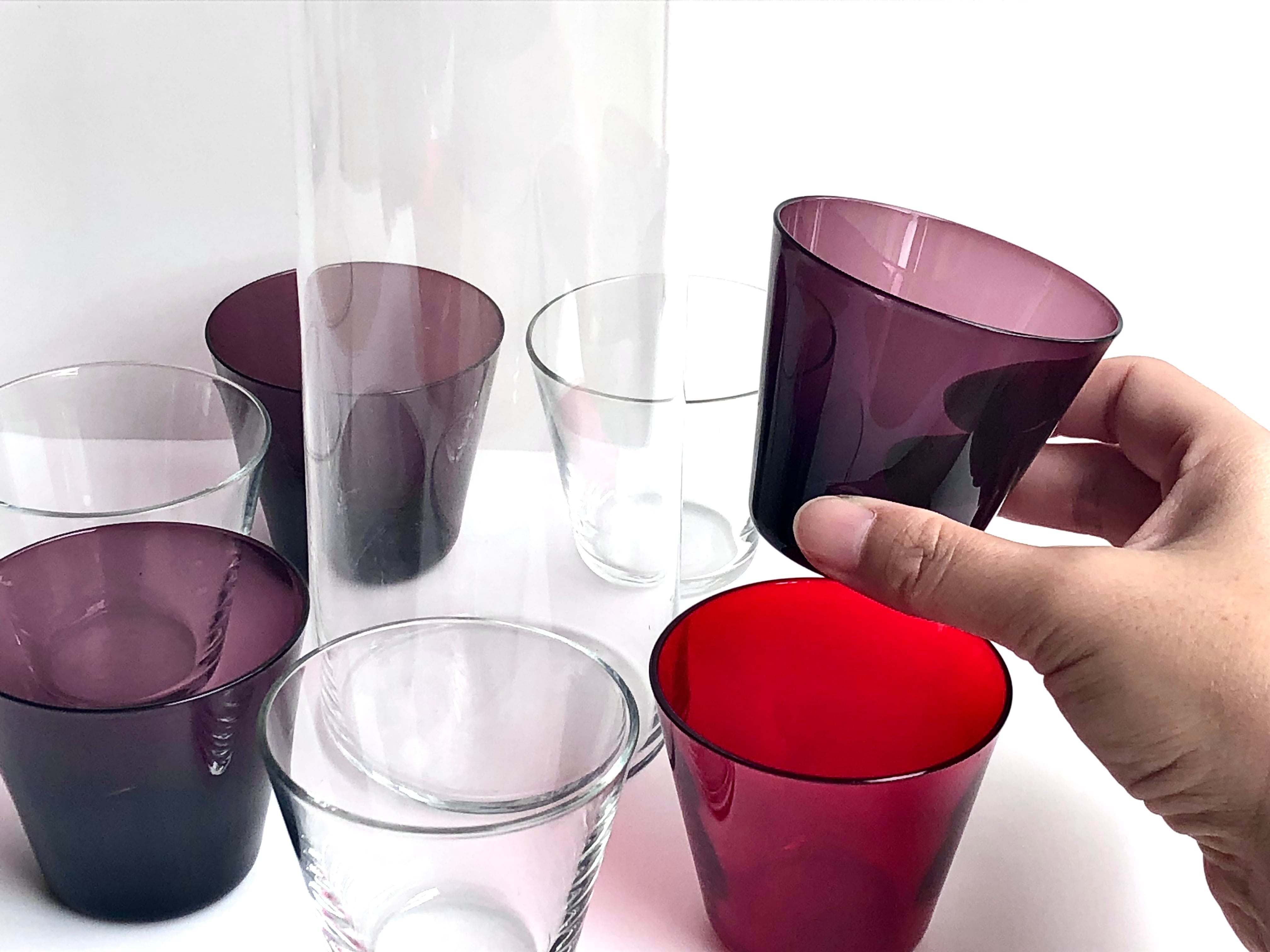 製造時の物ですが、タンブラーのクリアとダークライラックの各1つに、口元の形成によるざらつきのようなものがみられます。また、ピッチャーは側面の下側に、グラスはごく一部のアイテムに気泡がございます。またどのアイテムにも底にはマウスブロー特有のガラスの揺らぎがございます。