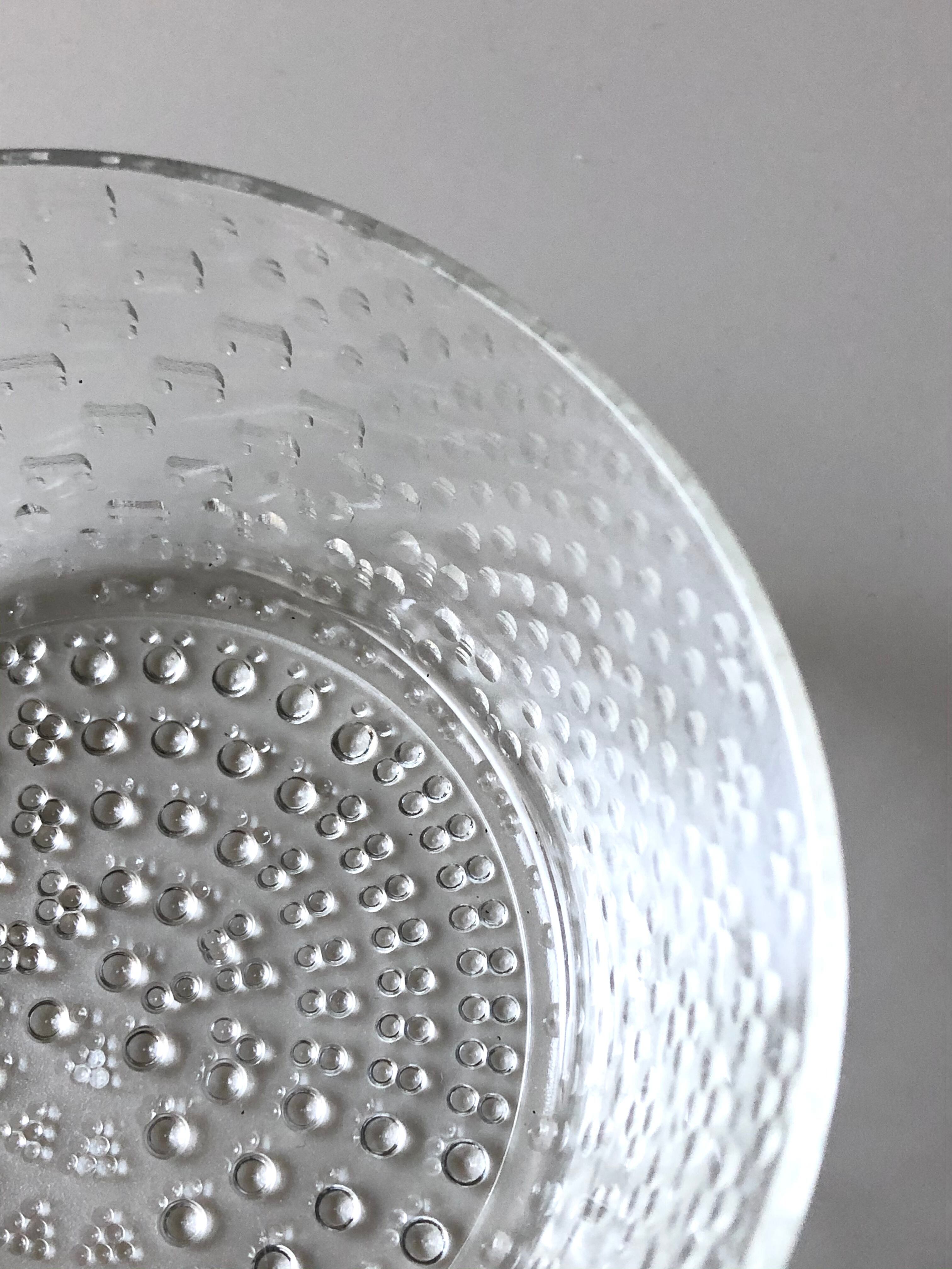 薄手のガラスボウルの形状はシンプルだけれど底の広さや、開口へのラインが絶妙に美しく、ガラスの表面には細かな点模様が形を変えながら増殖していくような図柄が幾何学的に描かれています。