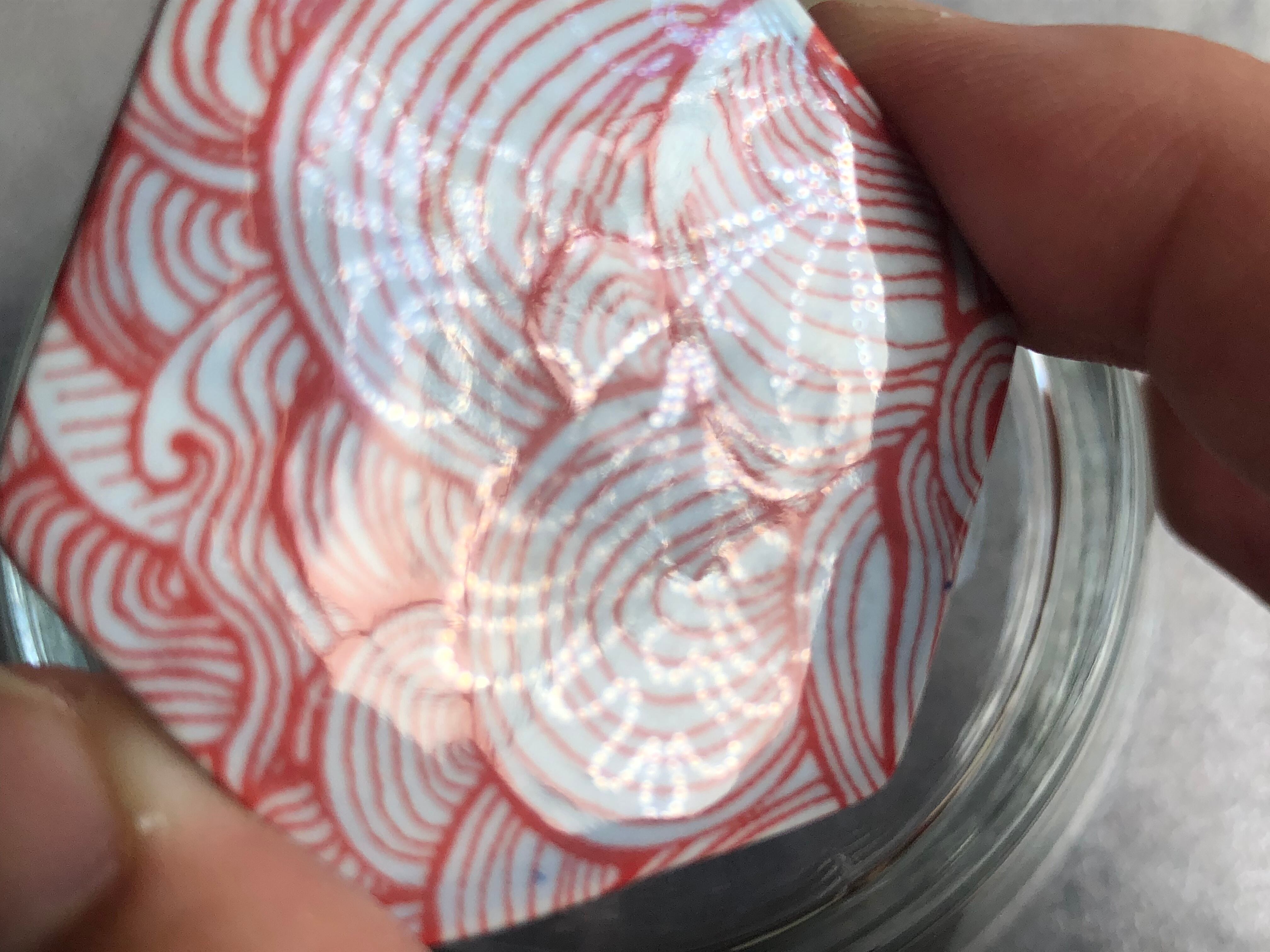 このミニヘキサゴンは、淡い水色の釉薬に、赤い波のシルクスクリーンが施されています。