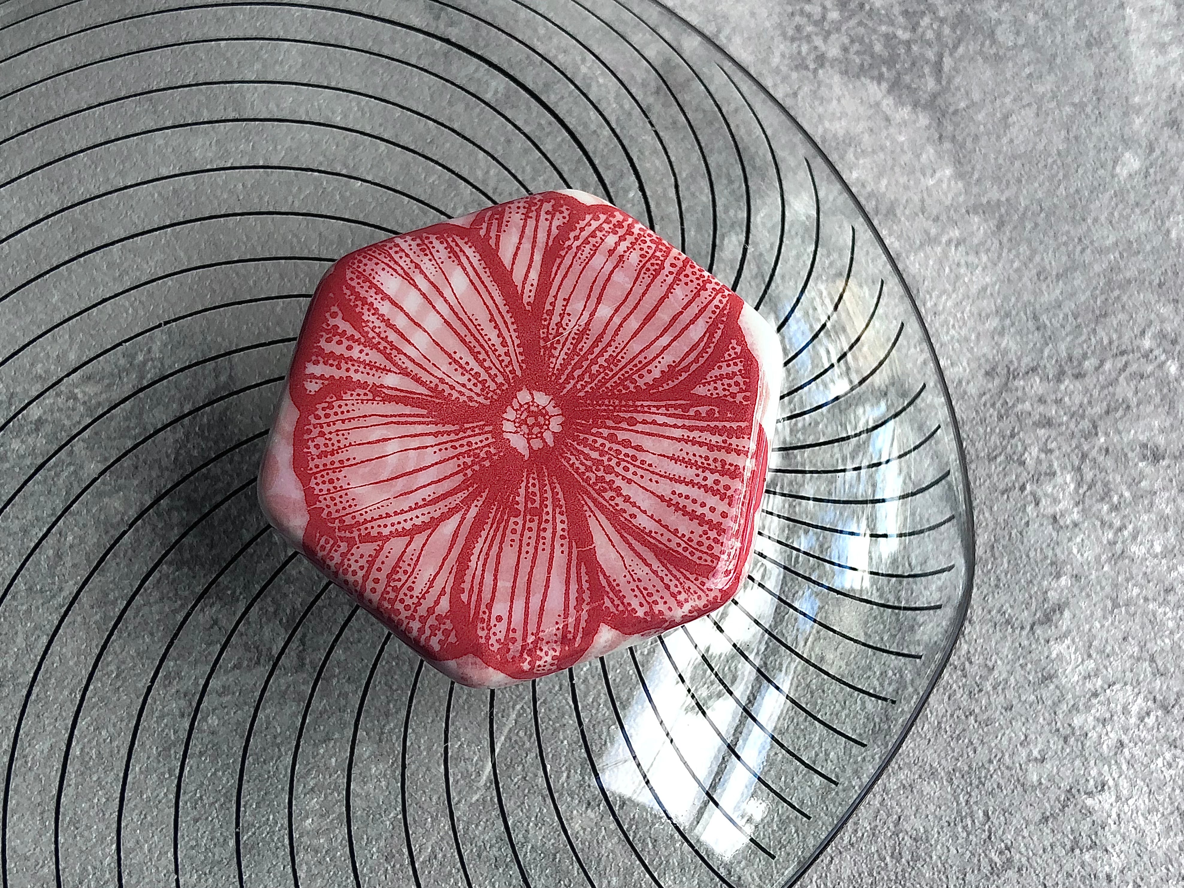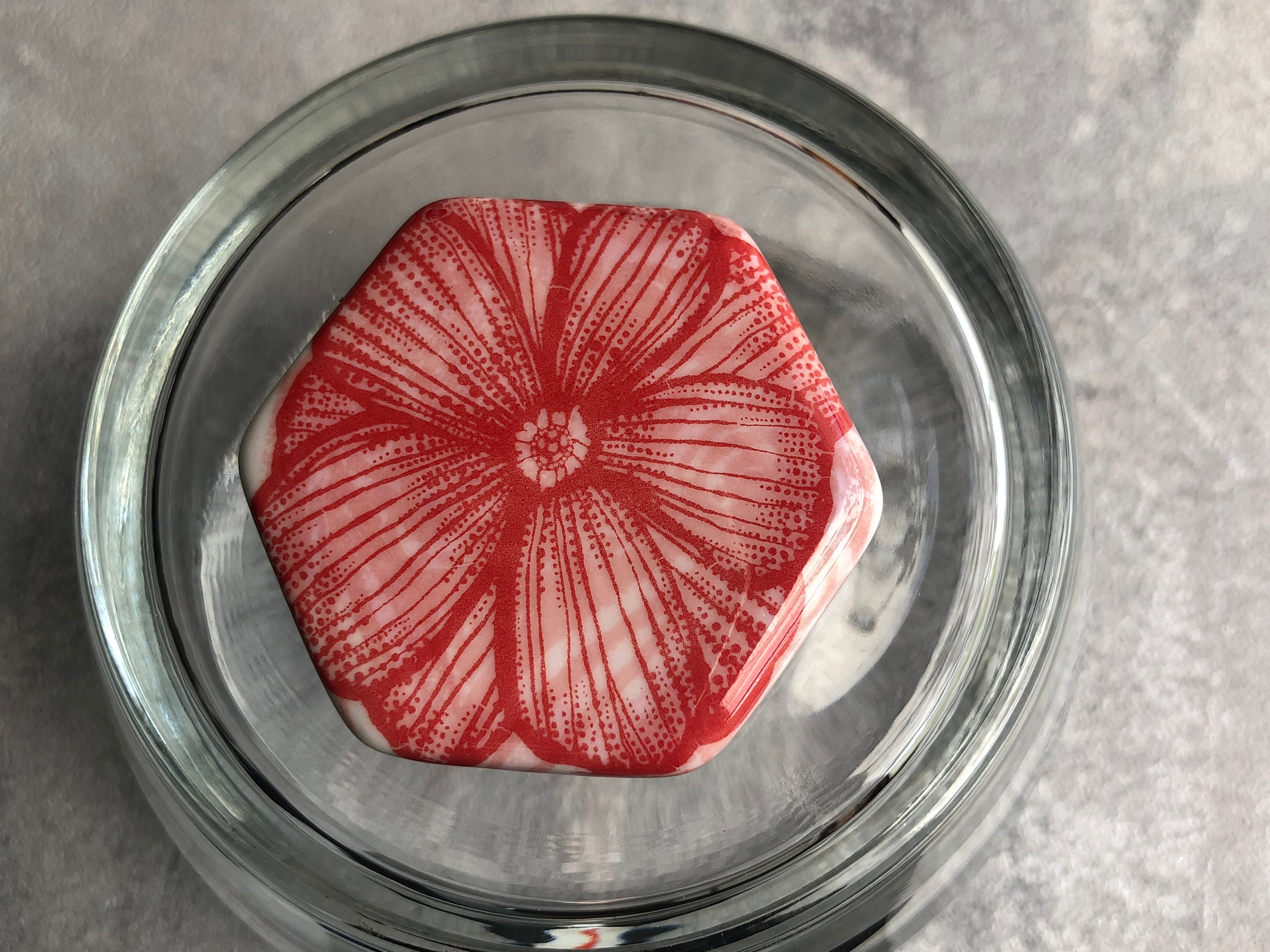 このミニヘキサゴンは、白地にのピンクの模様とその上から赤い大きな花がシルクスクリーンで施されています。