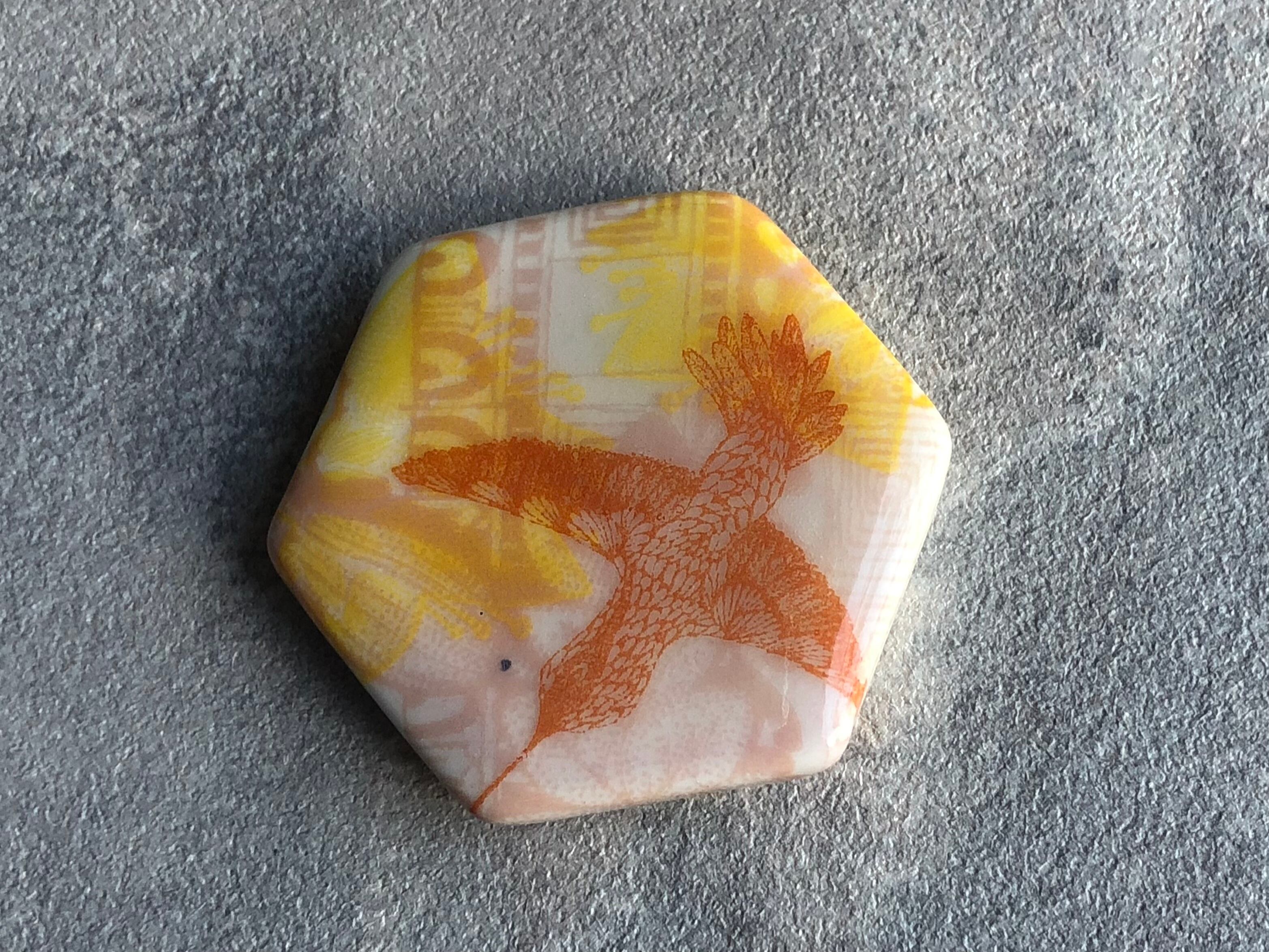 このミニヘキサゴンは、白地にのピンクの幾何学模様とその上から黄色い花模様、さらにオレンジのハチドリがシルクスクリーンで施されています。