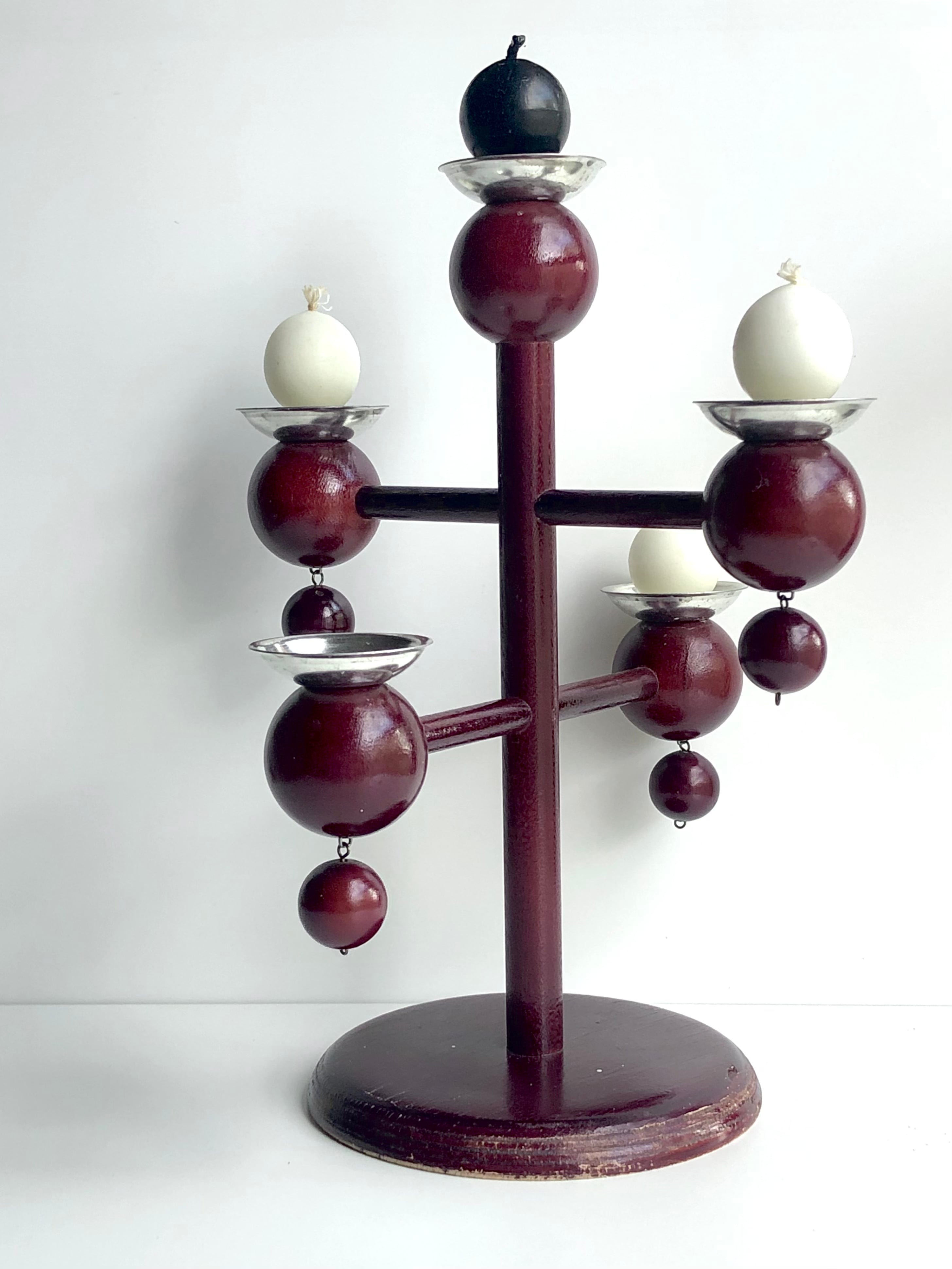本体は木製で深いあずき色に着色されており、取り外し可能な金属製のキャンドル受けと、フィンランドの伝統的な丸いキャンドルが当時のまま付いています。