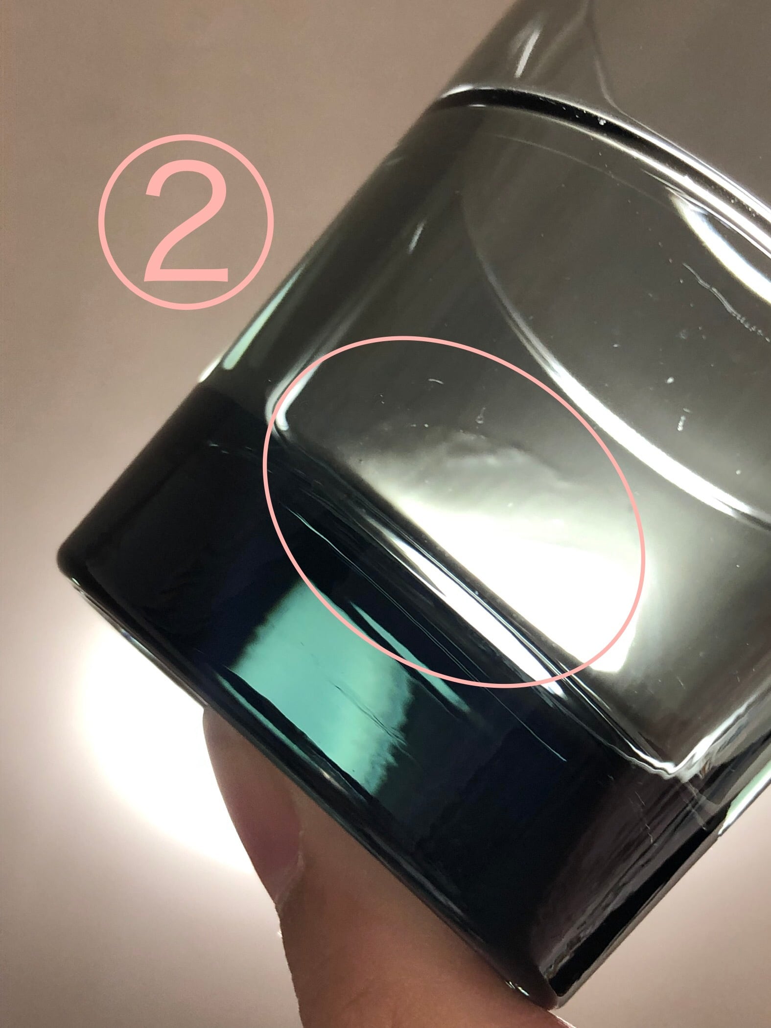 製造時の問題でガラスの皺や小さな気泡の混入、口縁部の仕上げ(ガラスを焼いて口元を滑らかにする処理)で生じたガラスの変色などが見られます。
