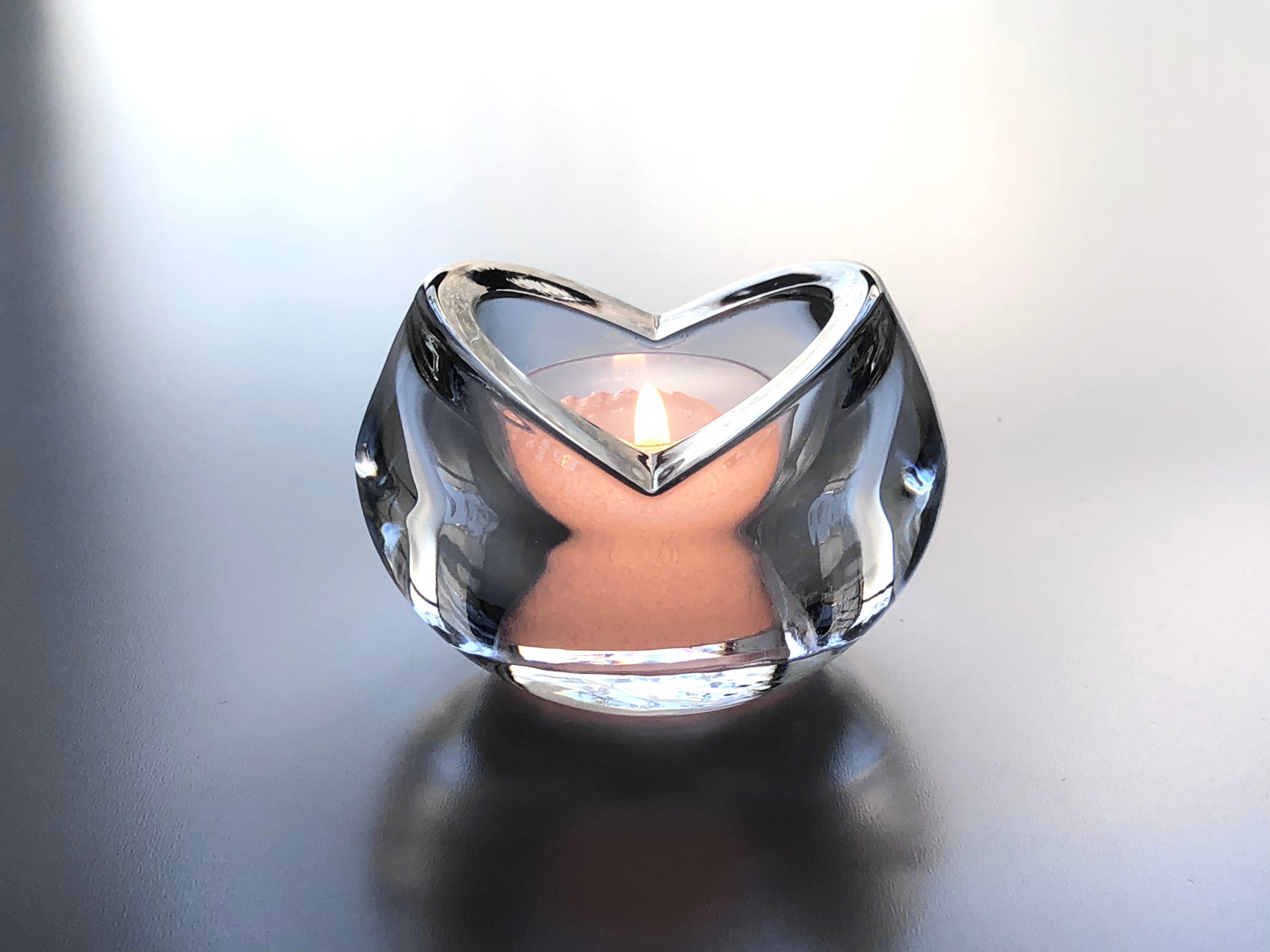 花や葉が開く前の神秘的な姿が象られた神秘的なデザインで、な厚いガラスの谷間に見えるキャンドルの暖かな色合いは見るものを静かに癒し、思考を整えてくれるだろうと思います。