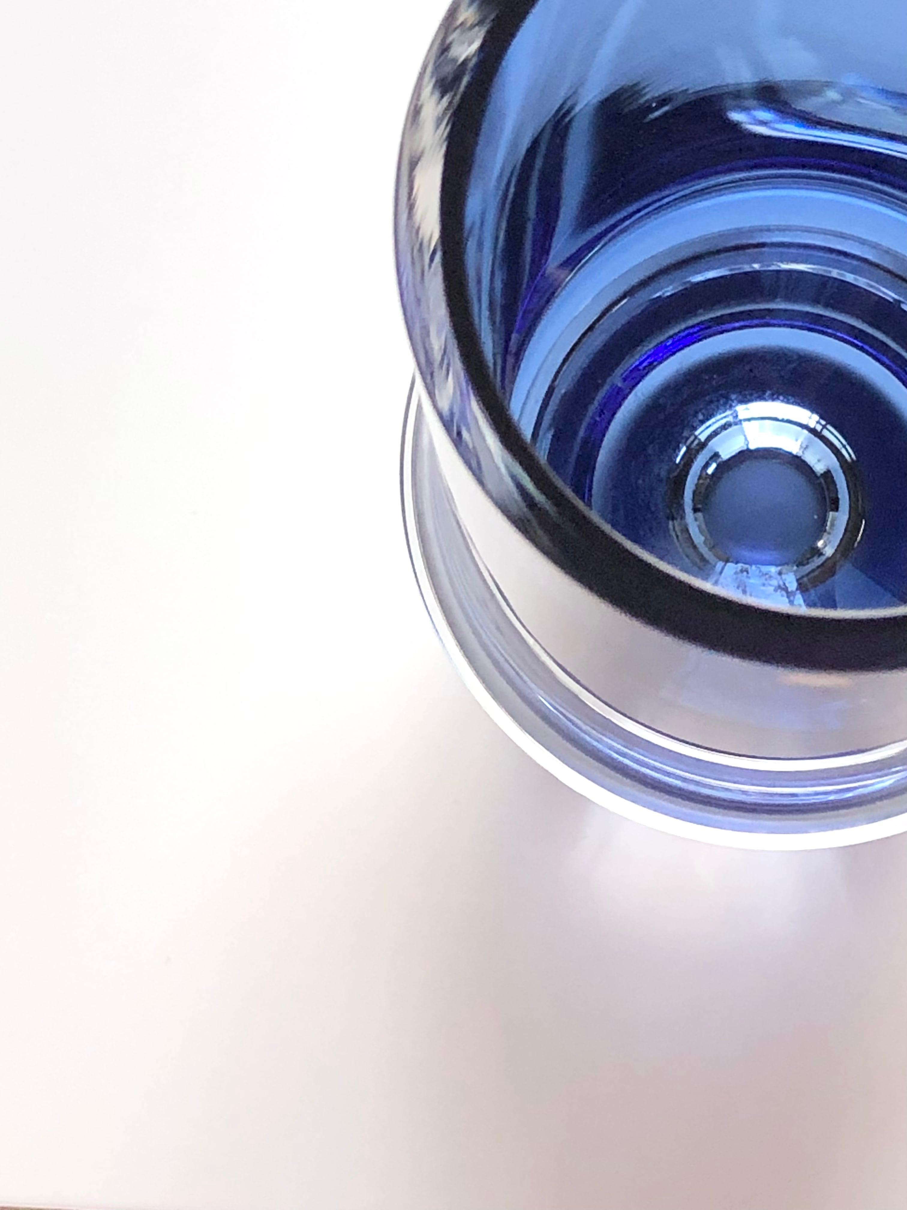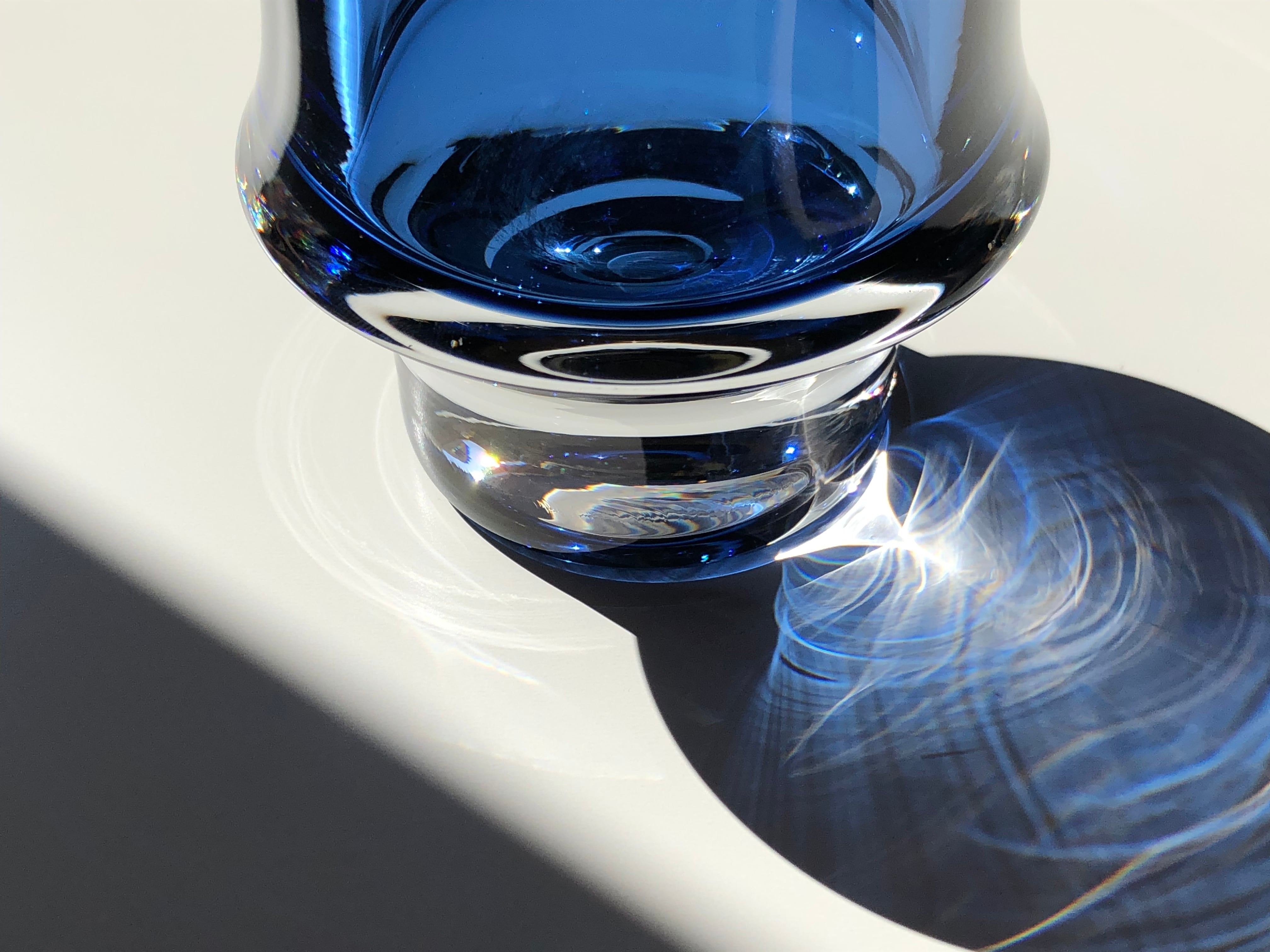 マウスブロウの型吹き技法により一つ一つ手仕事によって重厚に作られており、底にはクリアガラス、ボウル部分にはブルーのガラスが用いられています。