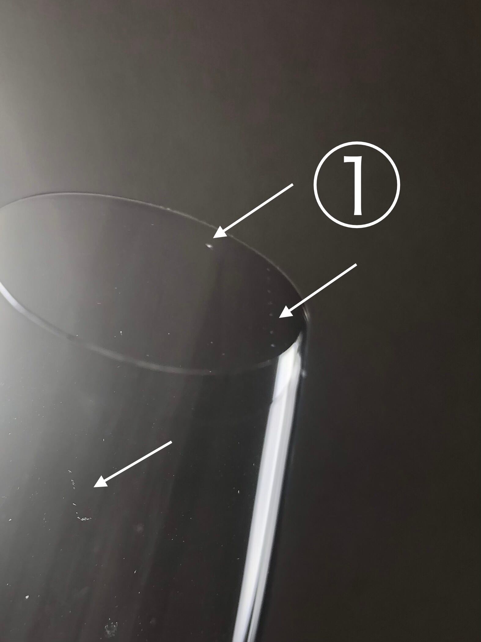 製造段階のものですが、僅かな気泡やグラスの口をカットする処理によって、口の内側に小さな削れまたは窪みのようなもの(光に透かしてよく見なければわからないような極小のもの)が生じることがございますが、正規の製品として販売されていたクオリティに問題のないものです。