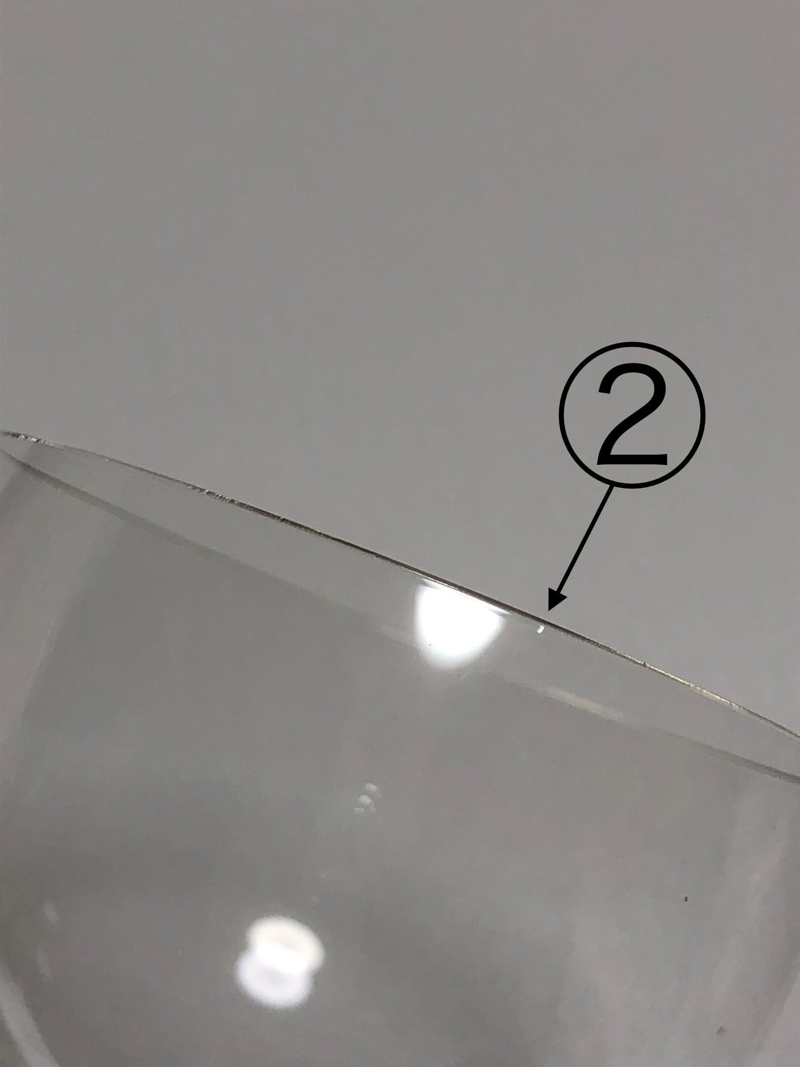 製造段階のものですが、僅かな気泡やグラスの口をカットする処理によって、口の内側に小さな削れまたは窪みのようなもの(光に透かしてよく見なければわからないような極小のもの)が生じることがございますが、正規の製品として販売されていたクオリティに問題のないものです。