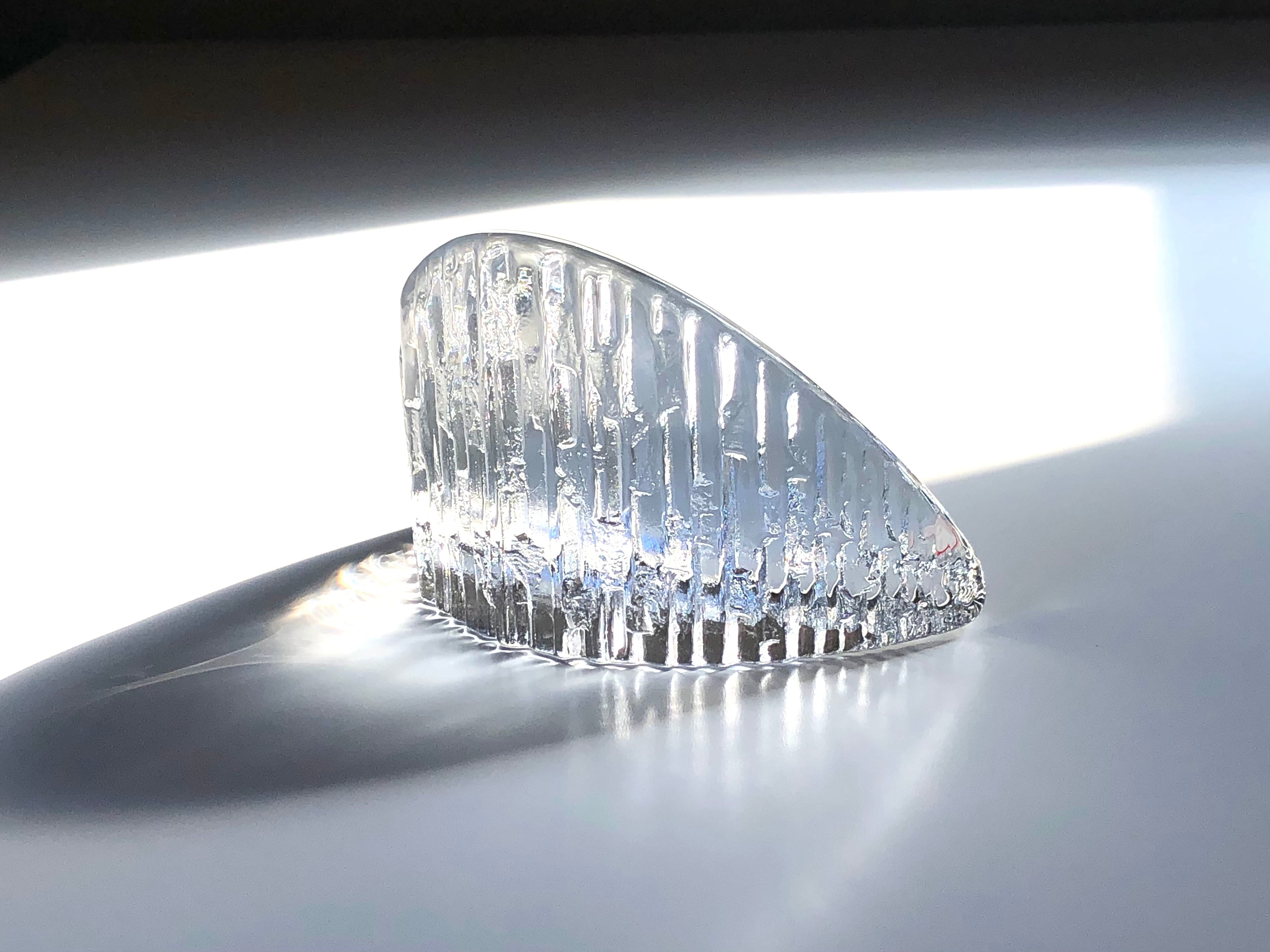Valto kokkoが残した同型のガラスオブジェより一回り大きく、ガラスの裏側には確かに氷山の壁のように複雑な模様がエンボスで表現されています。
