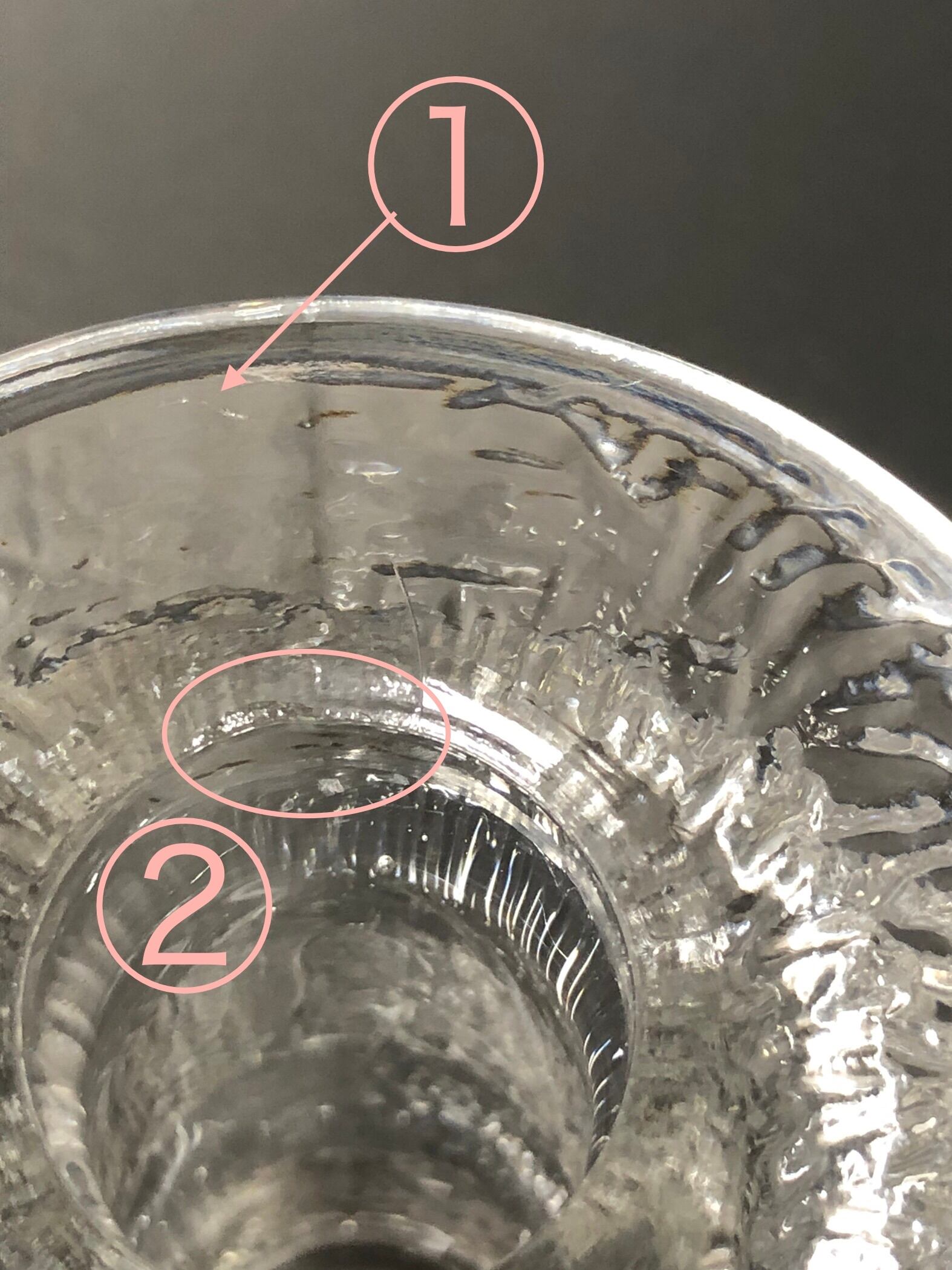 製造時の物として上部に線状のガラス皺があります。口の入り口製造傷のようなガラスの細かなもたつきがあります。その他わずかな気泡が見られます。