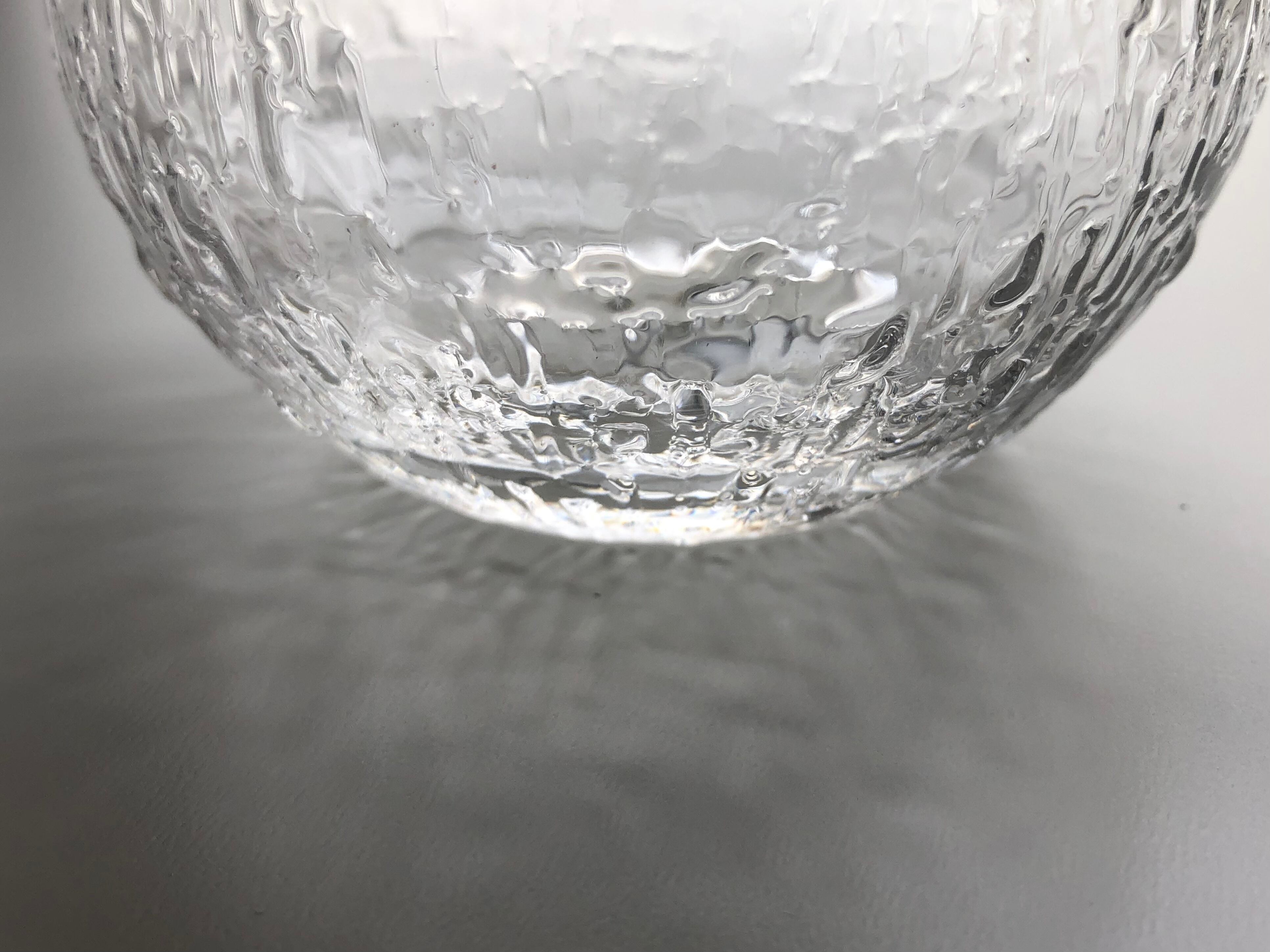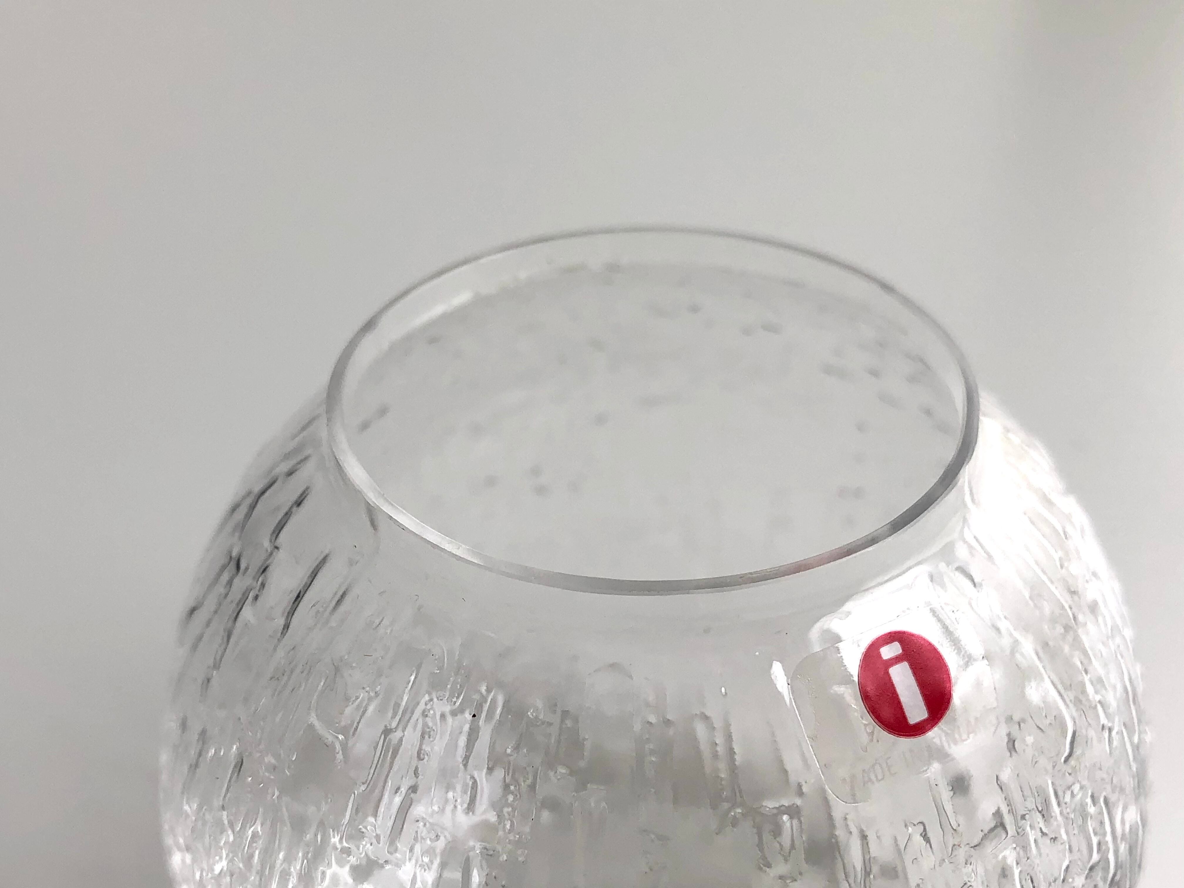 サルパネヴァは1960年代に木型を用いて、木の表面が焦げた跡をガラスにそのまま転写させたような有機的なデザインを多く生み出しましたが、このケッケリトの表面にも焦げた木型を用いたかのような模様がエンボスで表現されています。