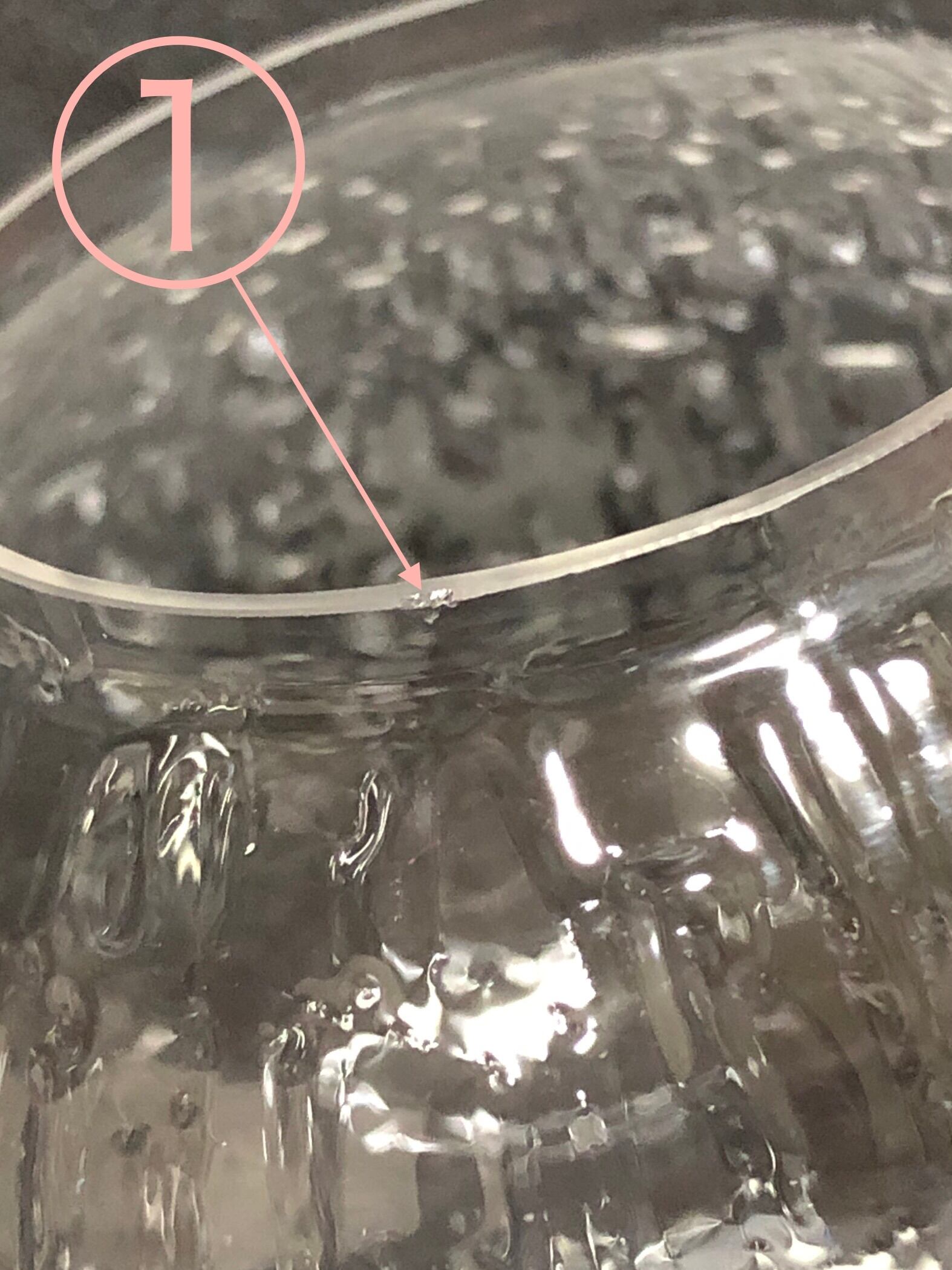 金属の蓋を外すとガラスの口が切ざらしになっているため、製造時に生じた微細なチップがございます。蓋の中に隠れてしまう部分なので使用時は全く気にならないと思います。