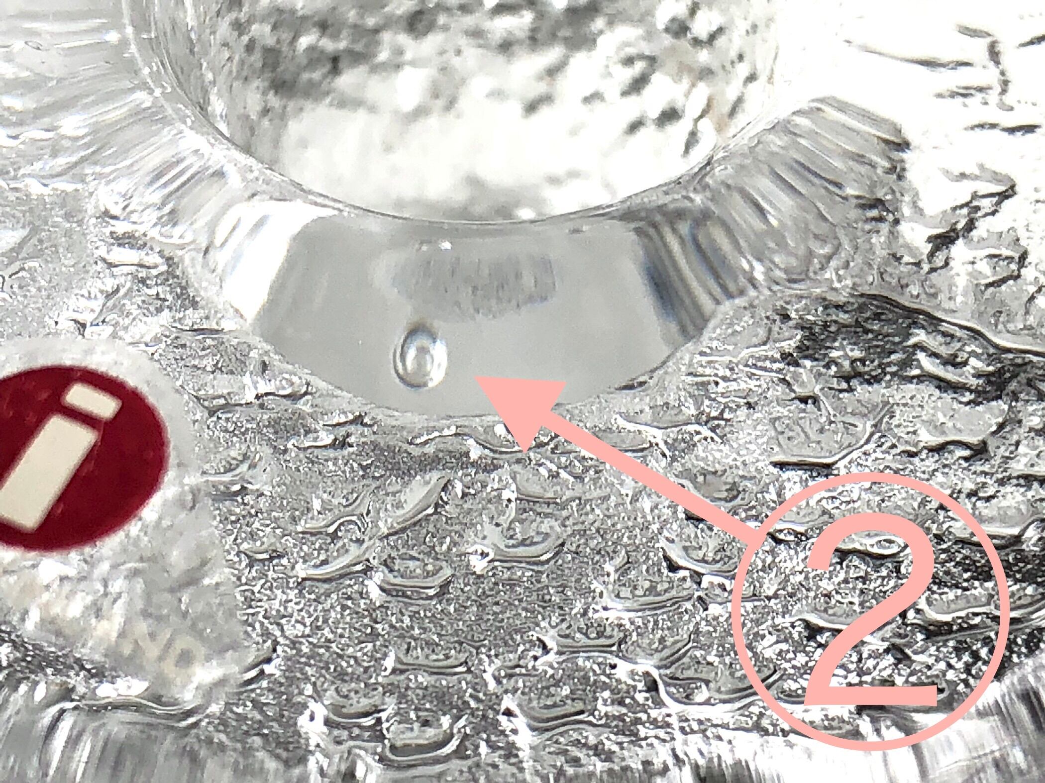 製造時状態として、ガラスの皴や気泡がございます。また、脚の部分に製造時に混入した薄い灰のようなものが見られますが、白いところでよく見なければ気になりません。