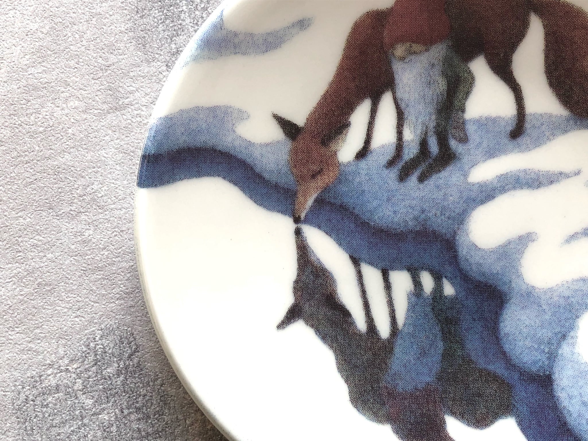 このプレートには、雪深い北欧の森の水辺で水を飲む狐と、その横で佇み水辺を見つめるトントゥが描かれています。