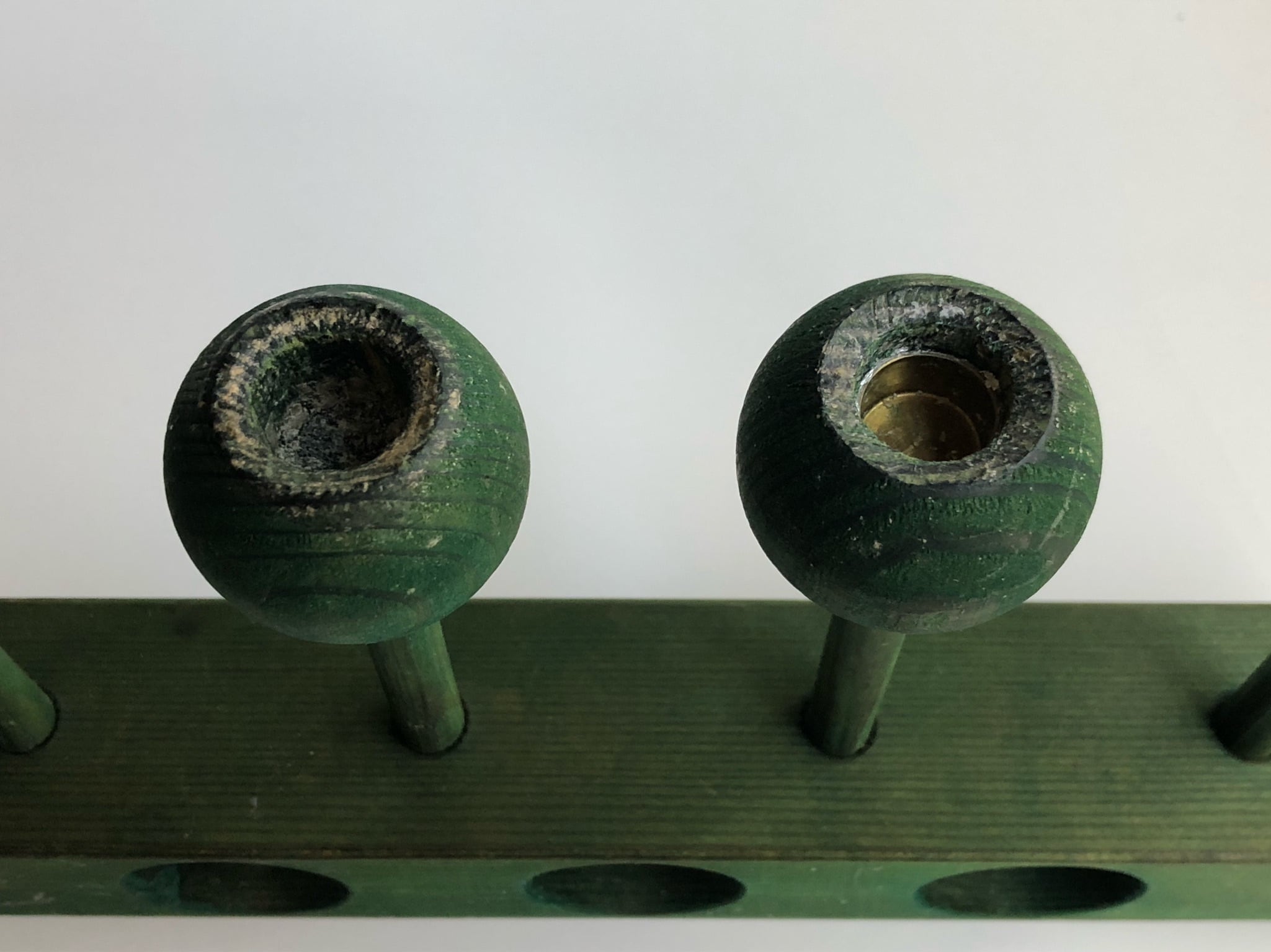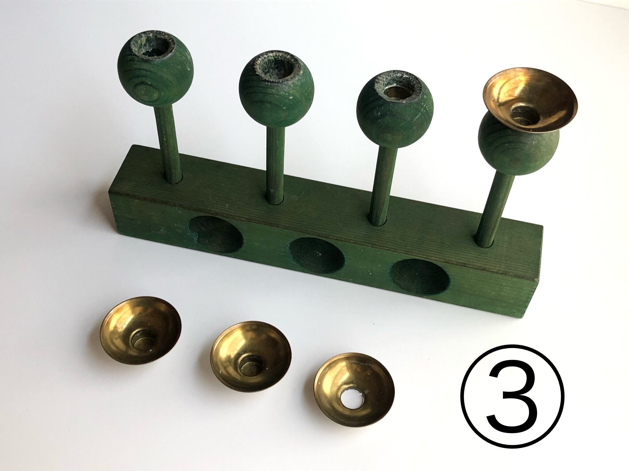 金属の4つのキャンドル受けの内、一つはしっかり台座にはまってしまっていて外そうとしても外れません。また内もう一つは受けの底が分離して台座にはまってしまっています。