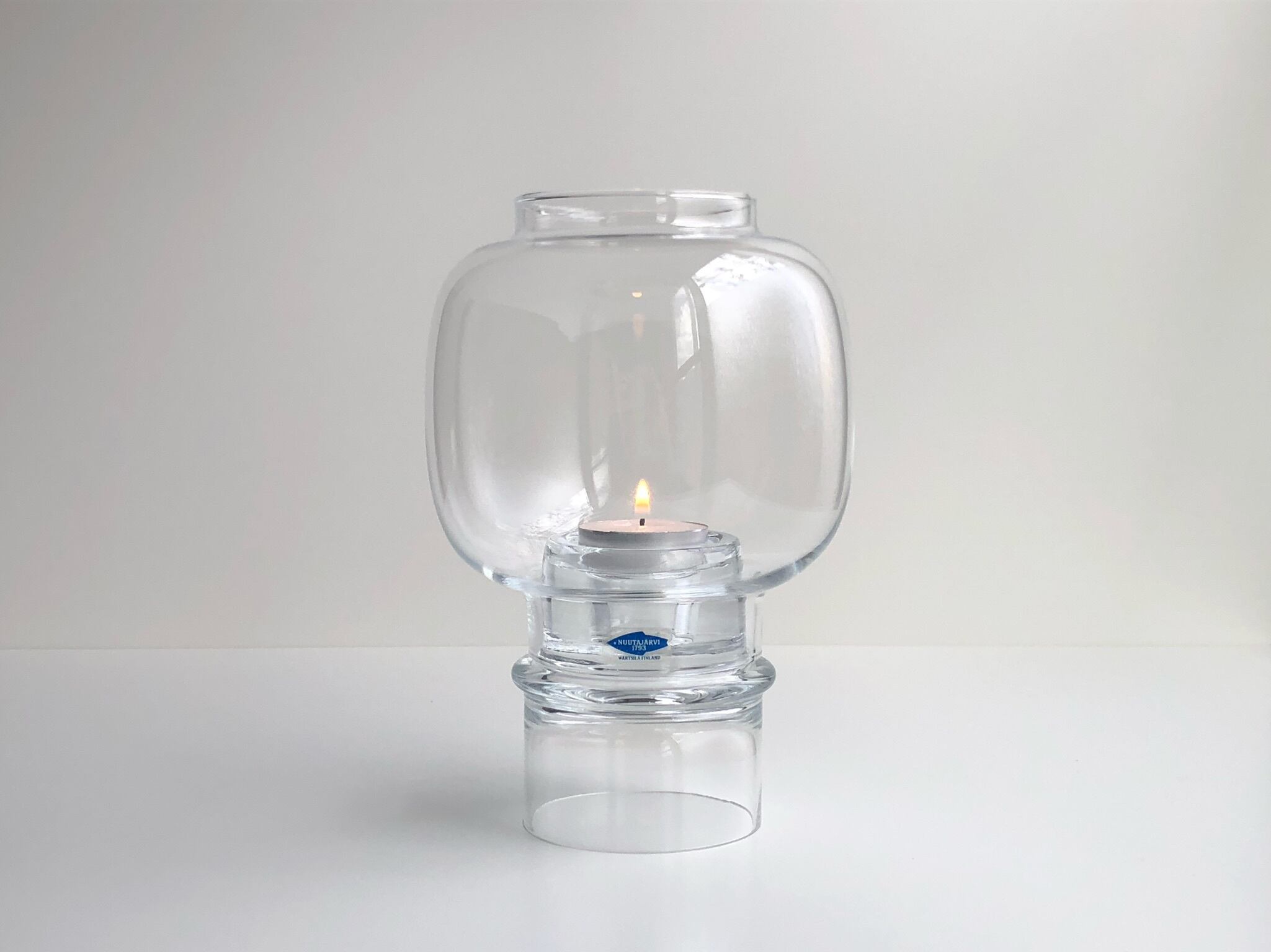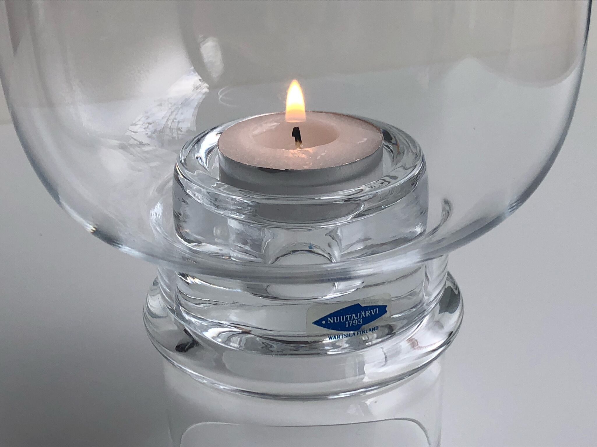 重みのあるガラスの台座には太さ2cm程度のテーパーキャンドルを挿す、またはティーライト型のキャンドルを嵌めて置くことができ、キャンドルに火をつけてから薄手のガラスカバーを被せて使用します。