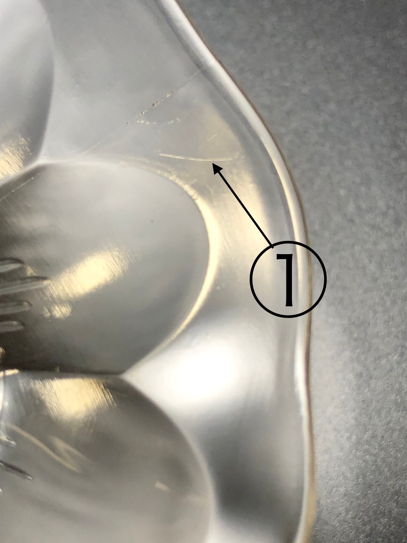 製造時に生じるガラスのヨレや縁の微細な泡状のあと、微細な皺が見られます。
