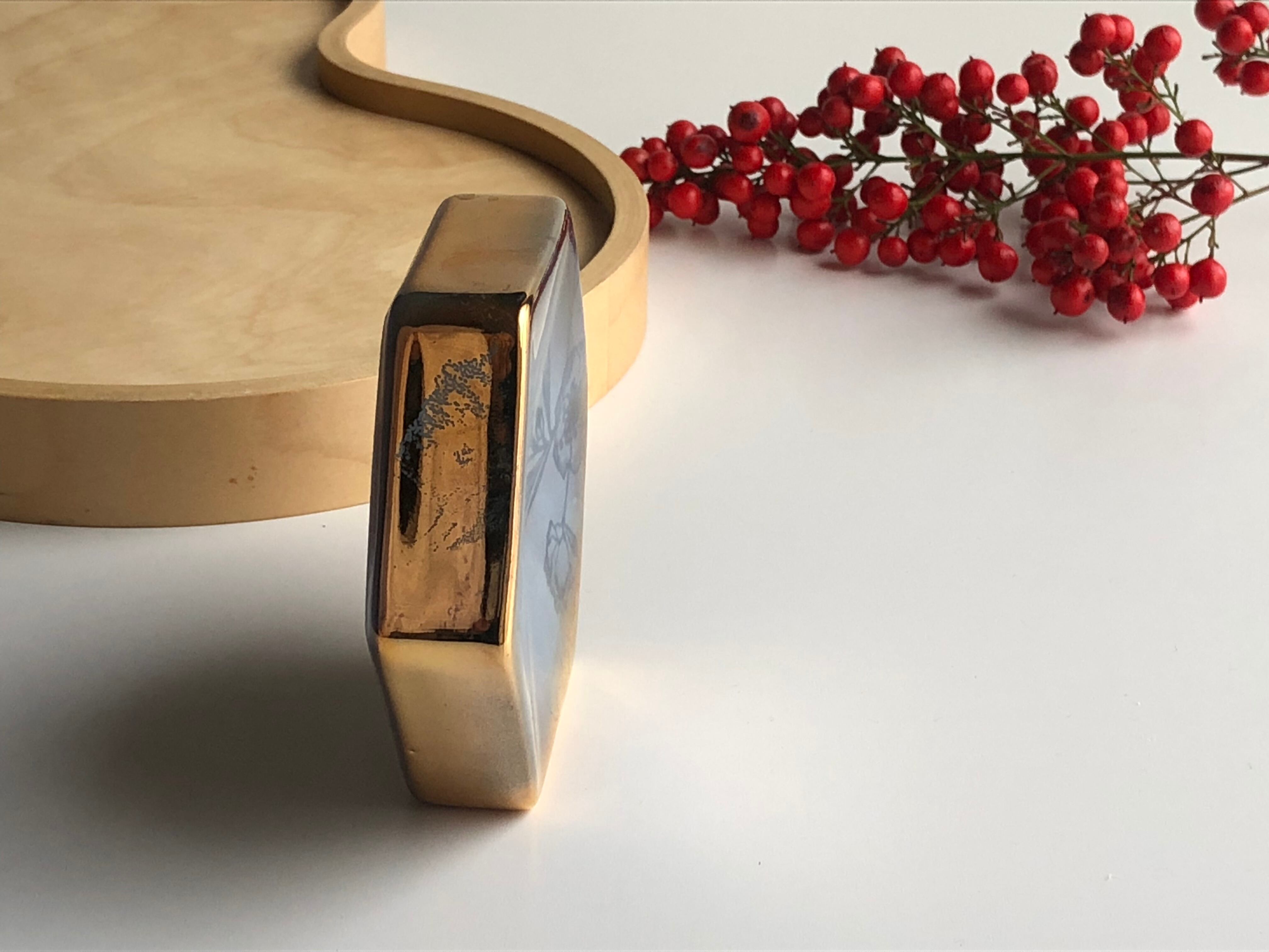 ベースにはシルクスクリーンの技法でブルー系の花模様が施されており、その上から本物の金を配合した釉で彩色されています。特殊な技法を用いて焼成することで模様とゴールドの境目が柔らかなグラデーションに仕上がった美しいお品です。