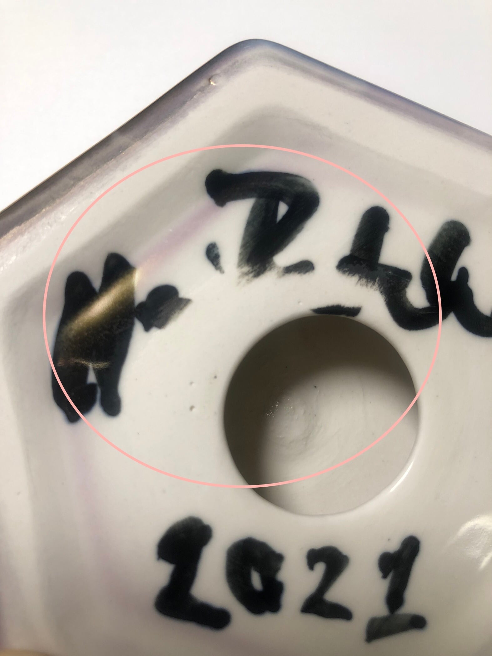 表面に釉薬の成分が浮き出たような跡があります。また、裏のサインが一部製造工程の処理で削られています。この二点の部分はマークアップしていますので画像でご確認ください。