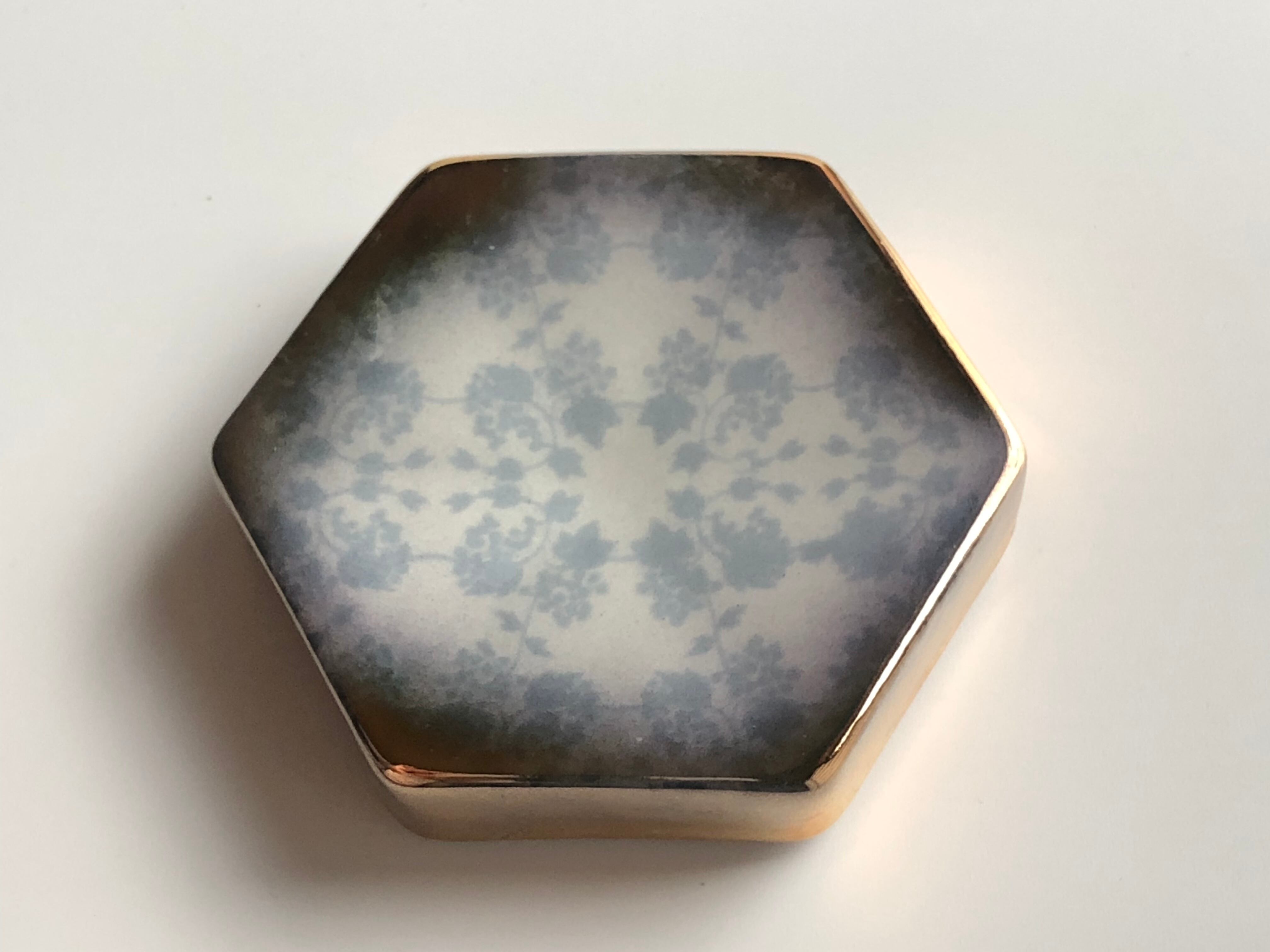 ベースにはシルクスクリーンの技法でブルー系の小花花模様が施されており、その上から本物の金を配合した釉で彩色されています。特殊な技法を用いて焼成することで模様とゴールドの境目が柔らかなグラデーションに仕上がった美しいお品です。