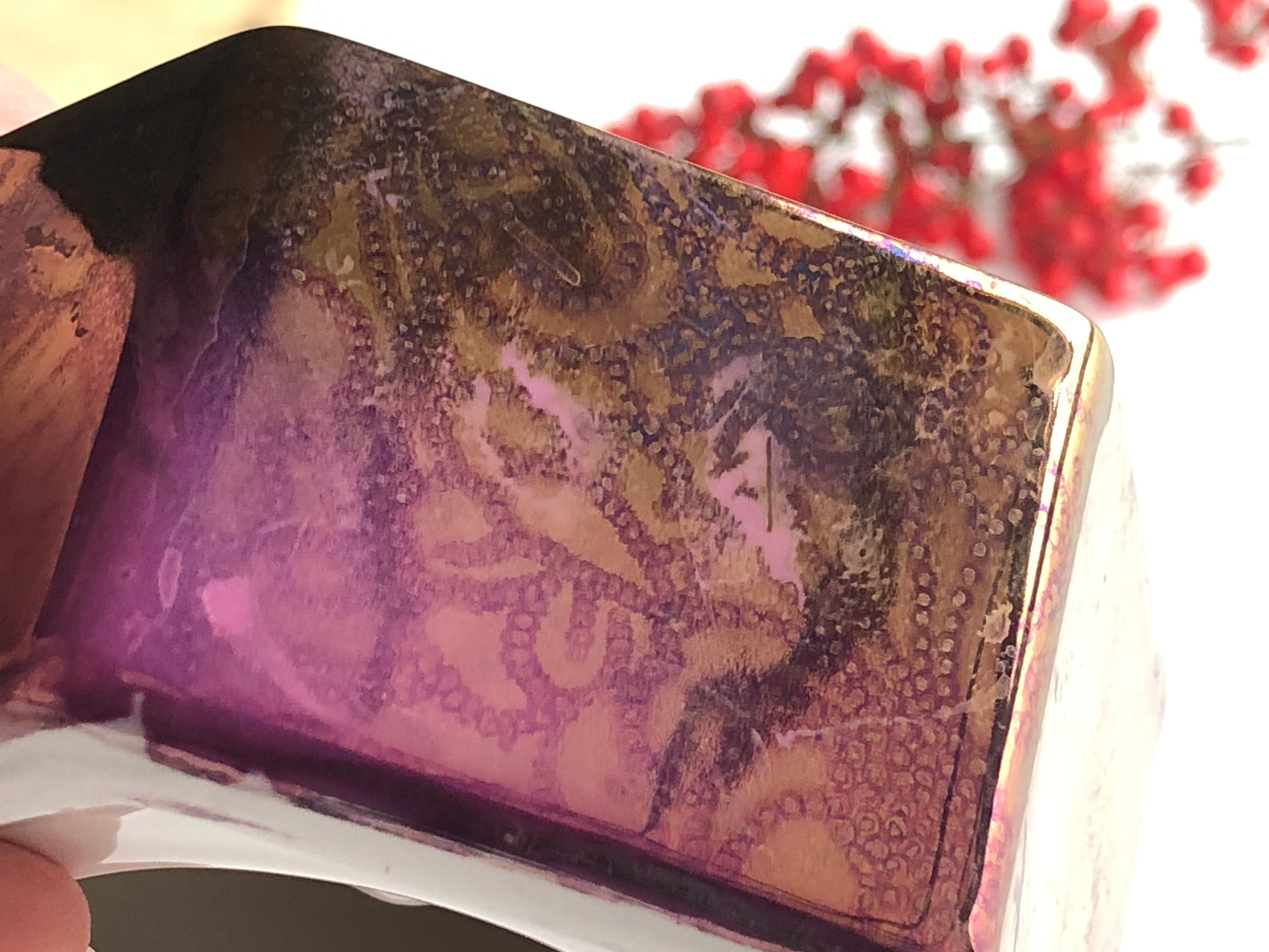 ベースにはシルクスクリーンの技法を用いて、パープル系のアラベスク模様が施されており、その上から本物の金を配合した釉で、模様が浮き出すように彩色されています。