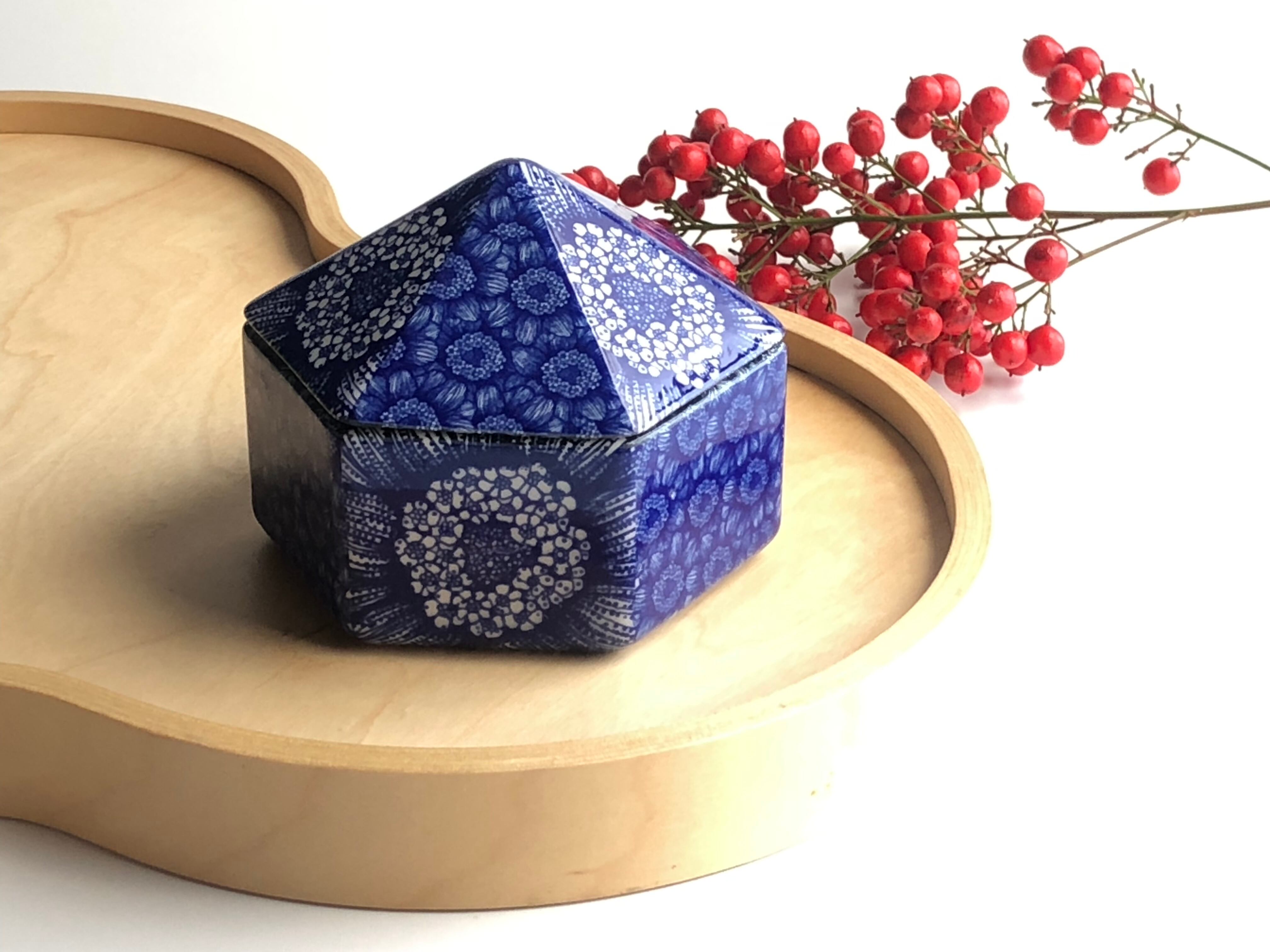 こちらは白地にブルーで、二種類のサイズの花柄が交互に施されているとても凝ったデザインです。蓋をずらして市松に柄を配置してもよいですし、柄の大きさを合わせて飾ることもできます。