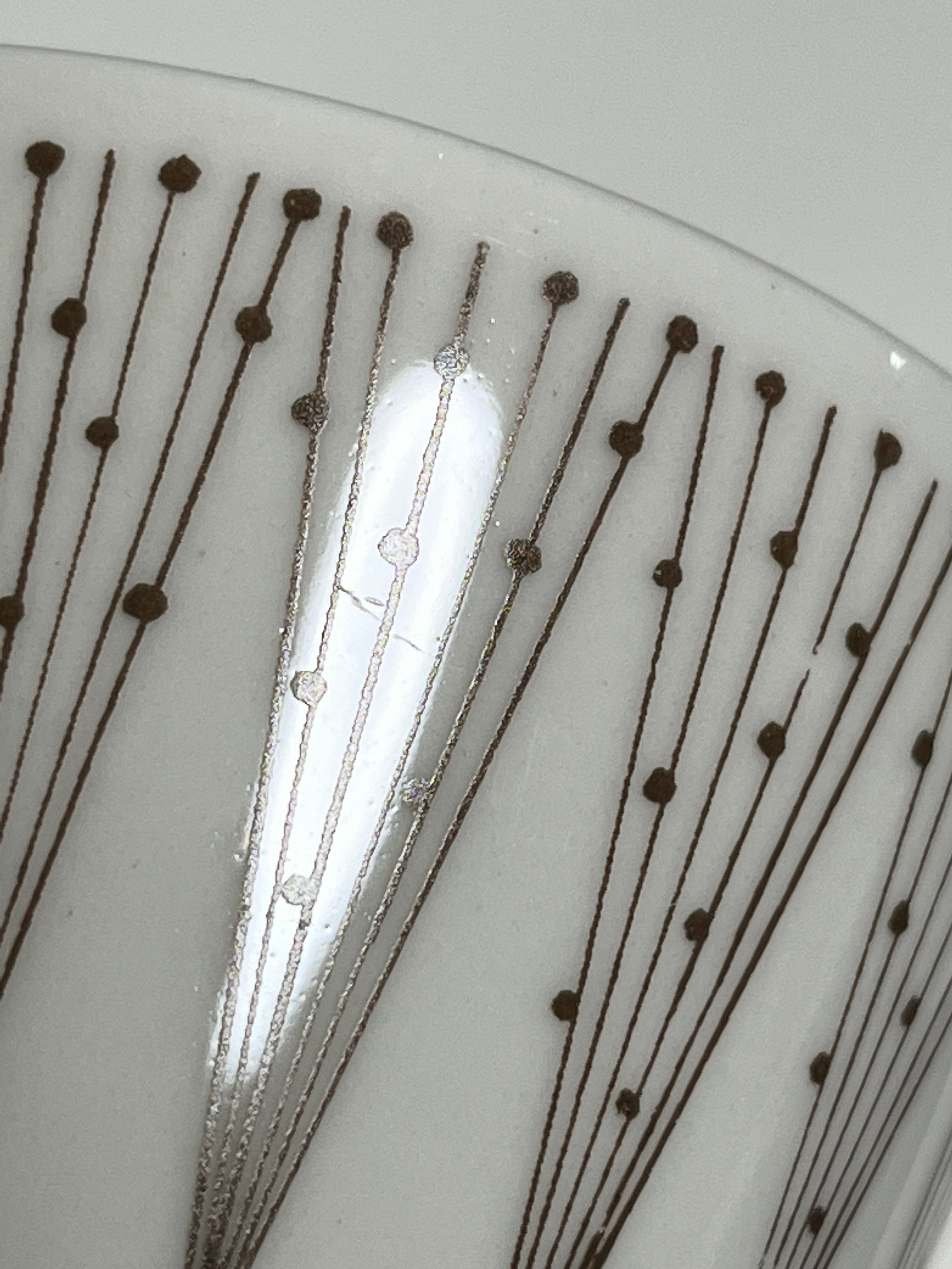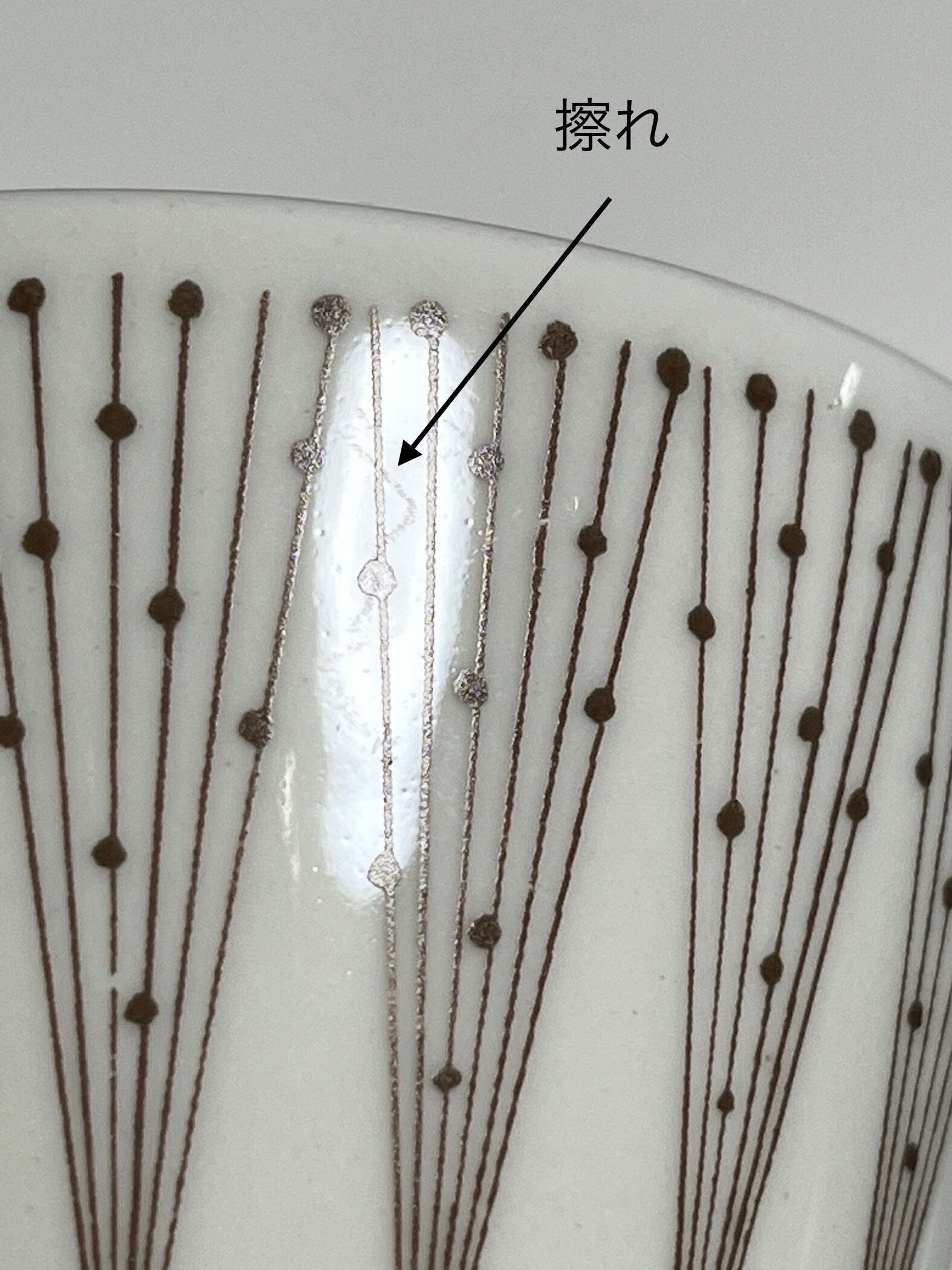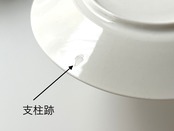 製造時からのもので、ハンドル部分の釉薬下に僅かな削れや形成ムラがあります(ヒビ等はありません)また、ソーサーの裏側に支柱痕支柱痕(焼き物がくっつかないように支える丸めた土「支柱」を外した痕)があります。その他、微細な釉薬ムラやピンホール、黒点等はどの個体にも見られます。