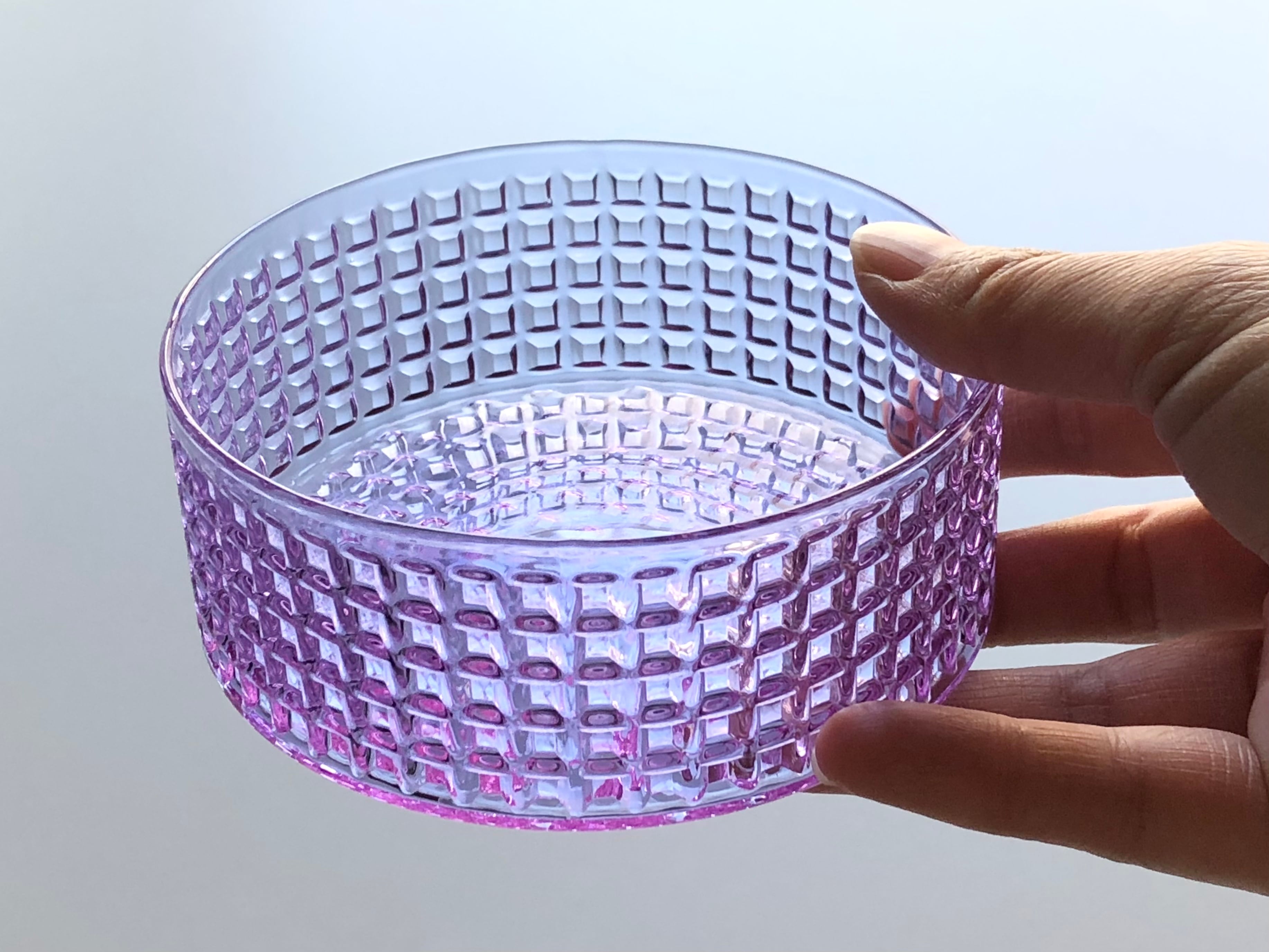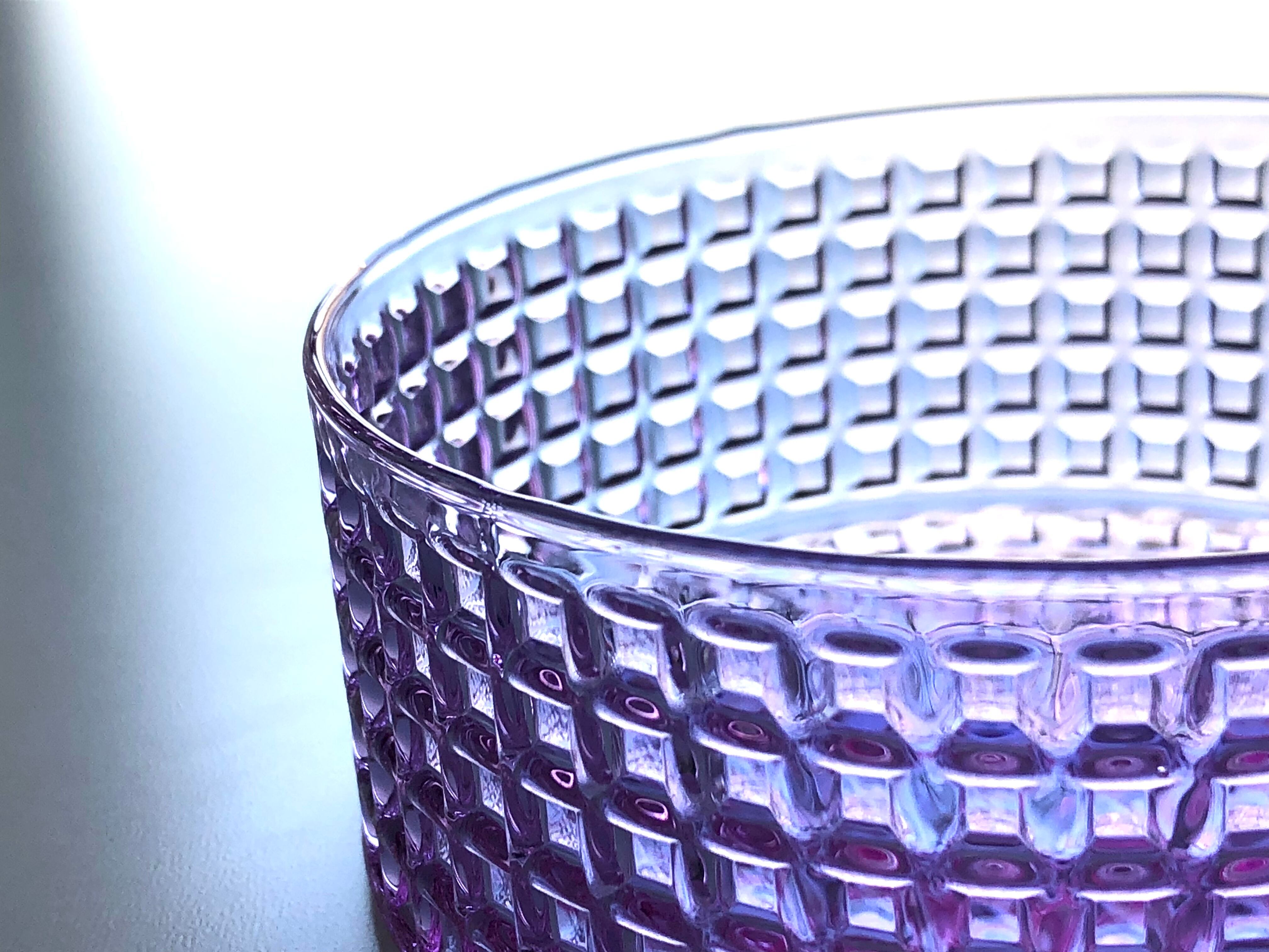 1970年にKaj Franck/カイ・フランクデザインによってデザインされたヌータヤルヴィ製のボウルです。マウスブロウによる薄造りの繊細なデザインで、側面と底面にマス目のようなエンボスで四角い模様が施されています。エンボスは側面の外側が凹み、内側が凸になっています。底は内側が平らで外側に小さな四角が凹んだ形で並んでいます。