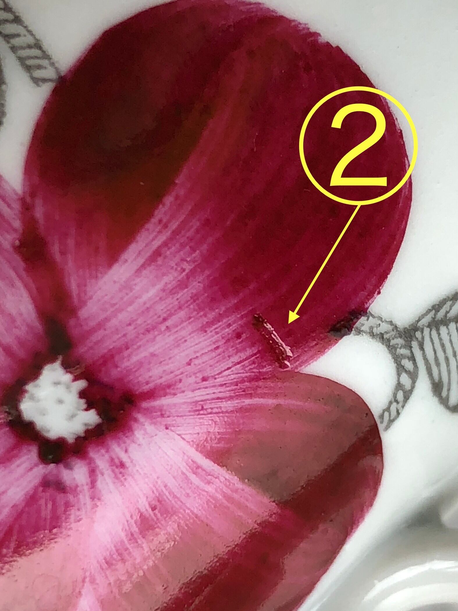 ソーサーには保管に伴うような極薄い擦れが見られますが、光にかざしてしっかりと見なければ気づかない程度のものです。使用感は感じられず、おそらく未使用なのではないかと思われる極美品です。このアイテムに良くみられるアウトラインエラーは僅かに見られますが、手彩色の花びら部分のペイントロスはほぼ見当たりません。