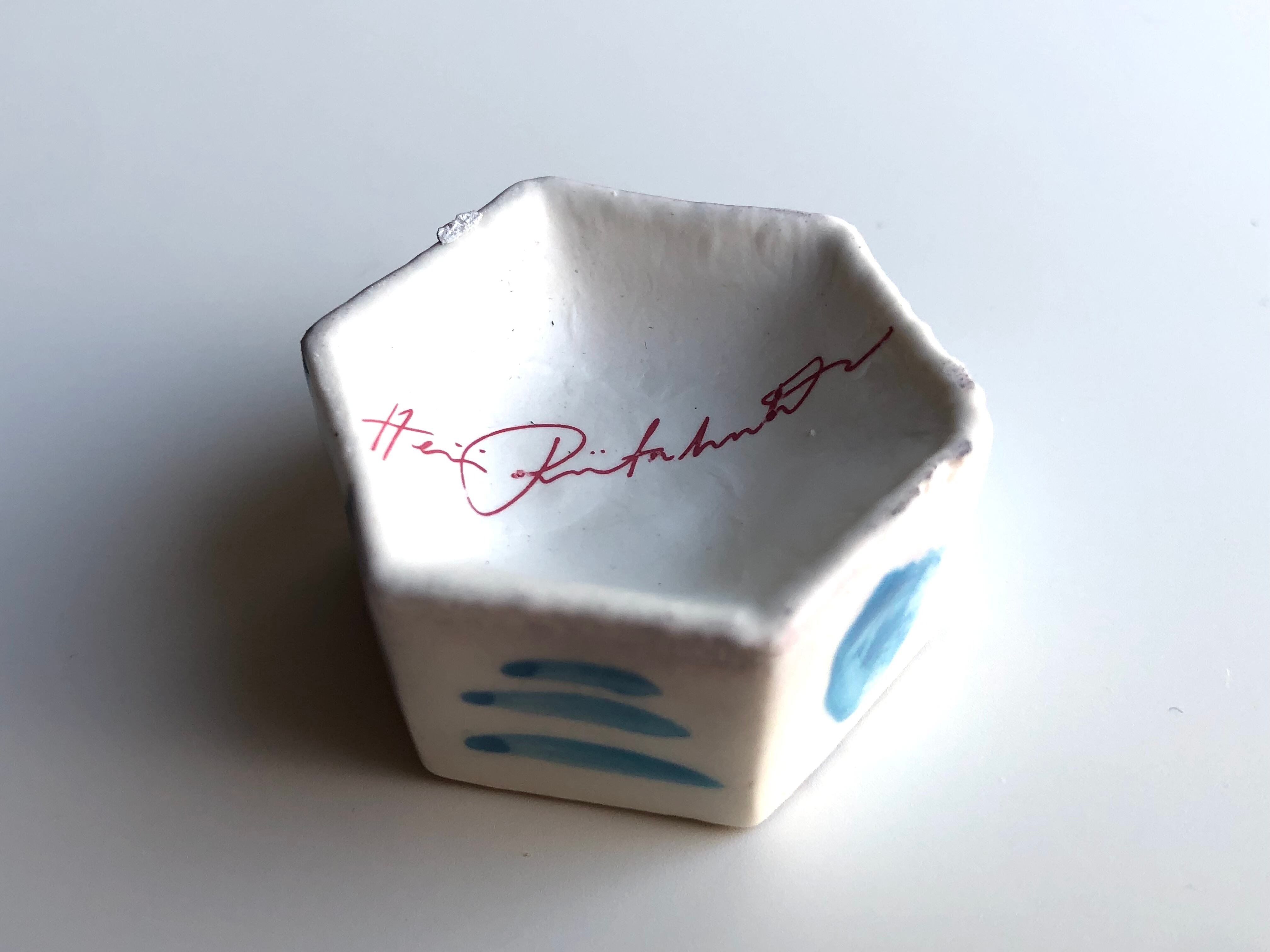 このアイテムはヘイニさんが自らが一点一点手書きで絵付けを施し、本物の金を配合した釉薬で彩色して仕上げた小さくとも贅沢なアートピースです。