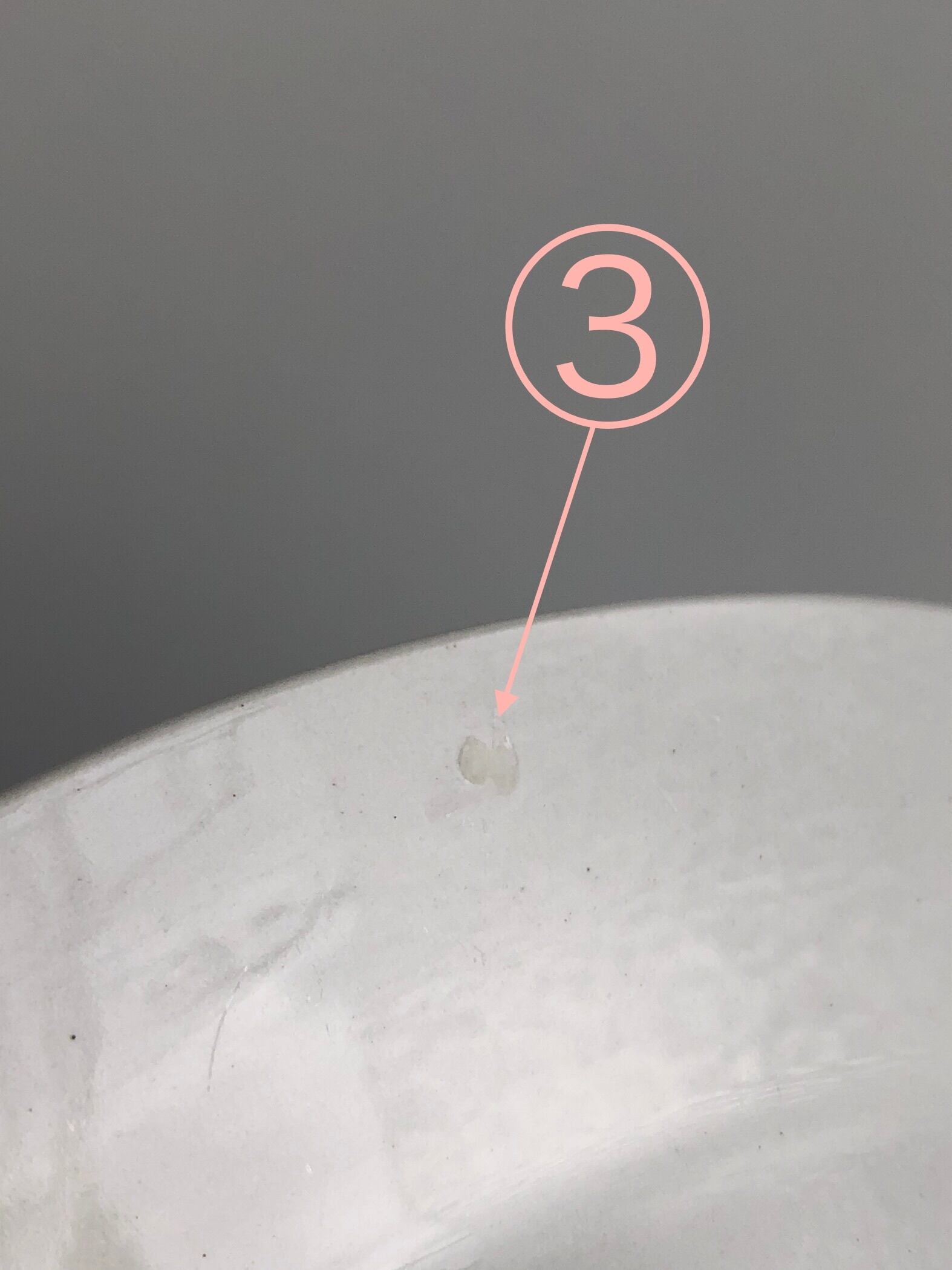 製造段階で生じる微細なペイントエラーが見られます。また、僅かな黒点や釉薬のスポット、釉薬のムラがありますがいずれもこの製品の特性としてほぼすべての個体にみられる状態です。