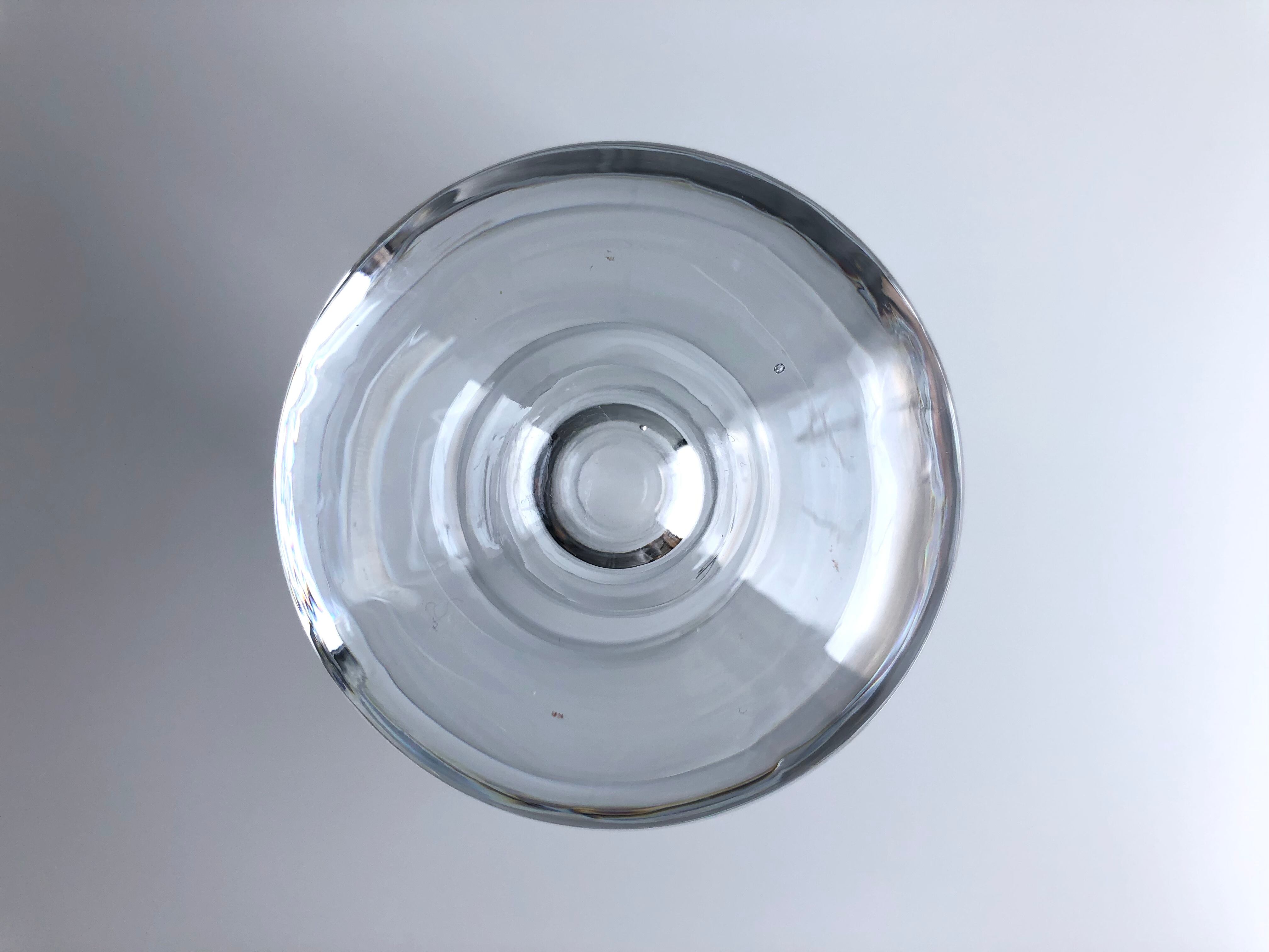 厚みのあるガラスの塊でできたフットに、少し口の窄まった大き目のボウルが短いステムの上に備わっています。