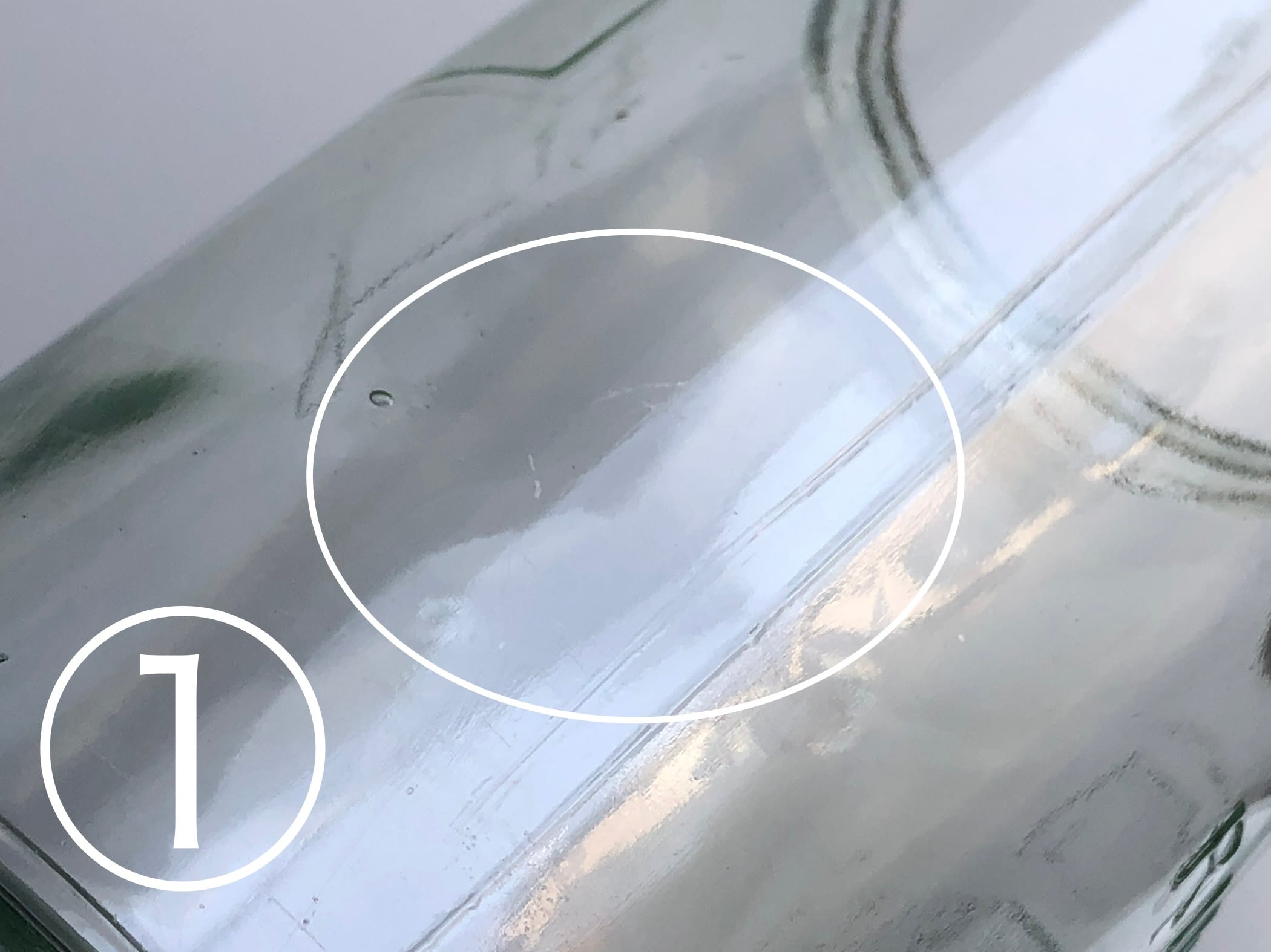 口の外側にプレスガラスの方の痕があり、その筋の位置にガラスのバリがあります。