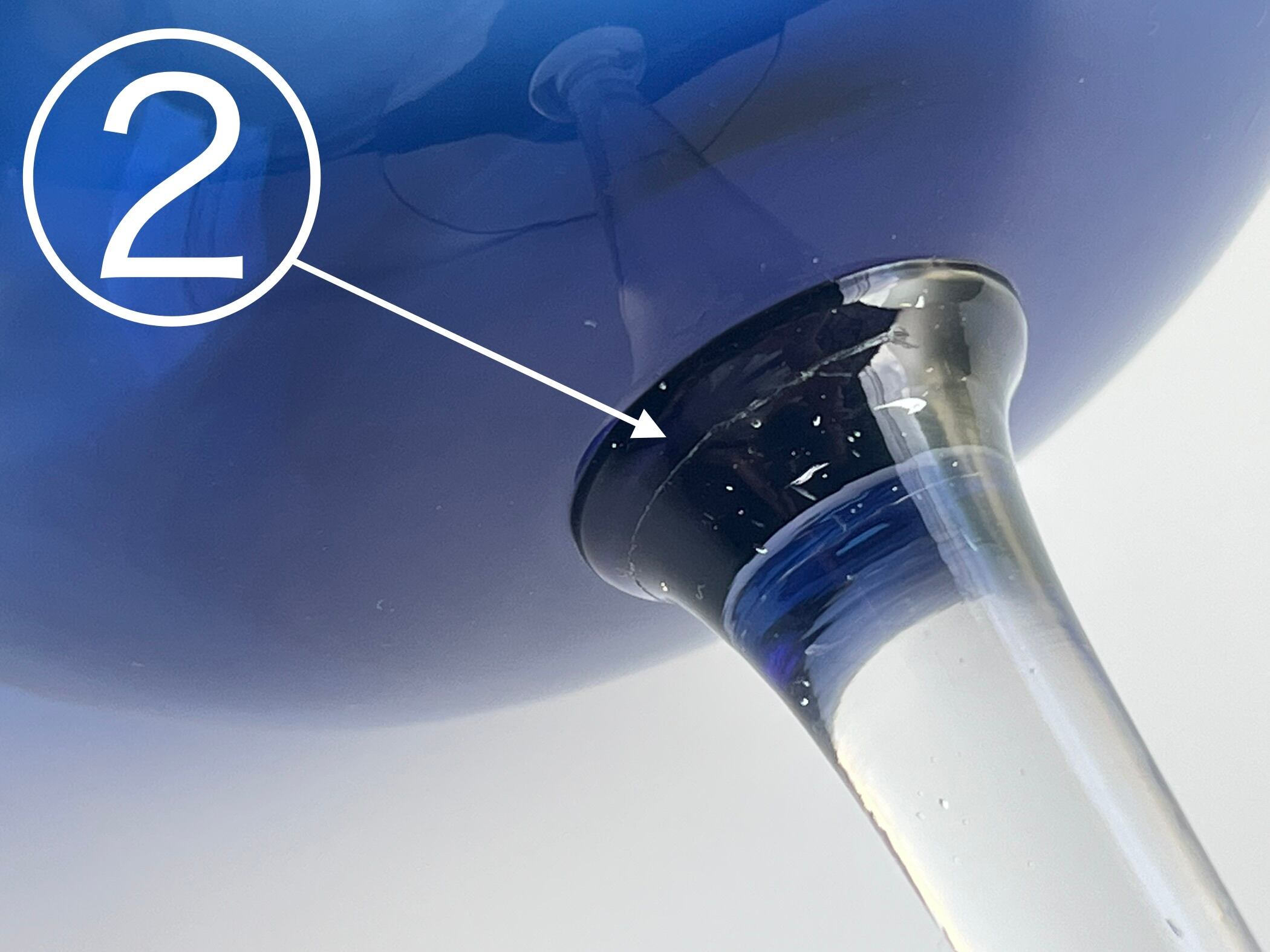 僅かな気泡、製造時よりみられる小さな筋、微細なガラスの揺らぎがみられますがいずれもこの製品の特性としてよくみられる物です。その他、ステムとボウルの継ぎ目部分に製造時に器具で抑えた際の筋のようなものが見られます。